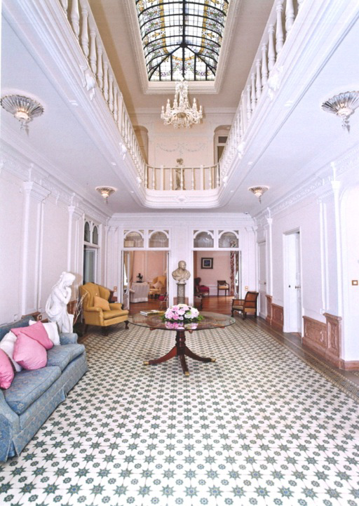 En entrant dans la maison, vous êtes accueilli par une superbe salle de réception pleine hauteur avec un palier en forme de galerie et un plafond en vitrail orné qui projette doucement des reflets de lumière sur les surfaces situées en dessous.