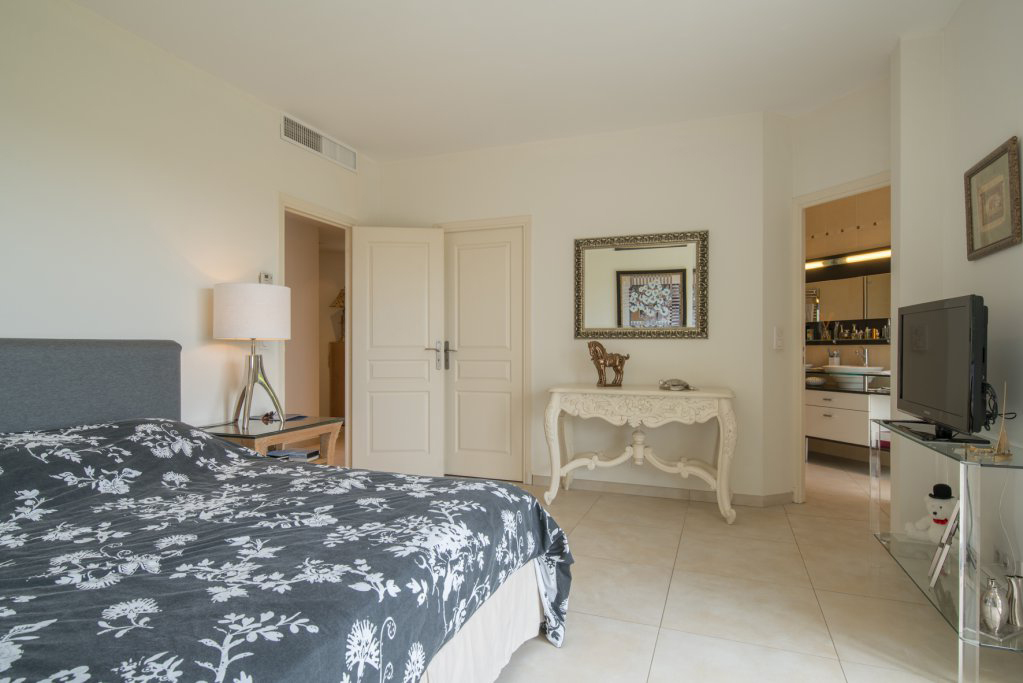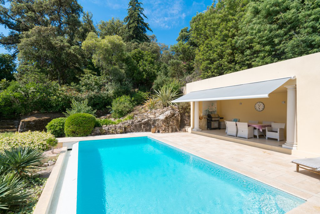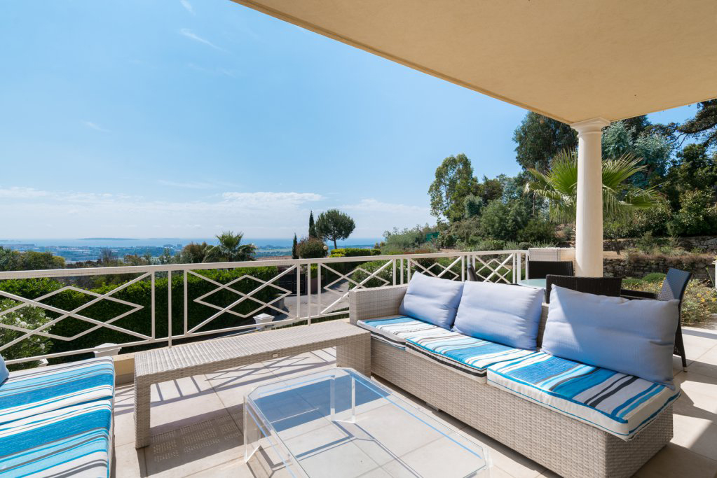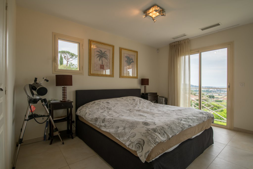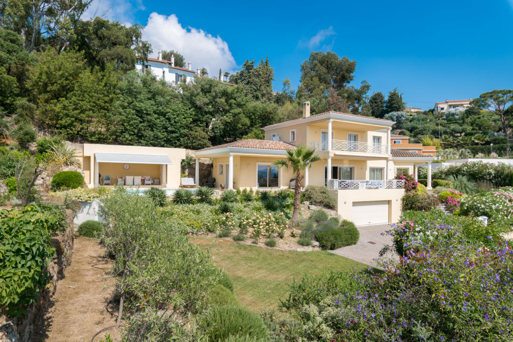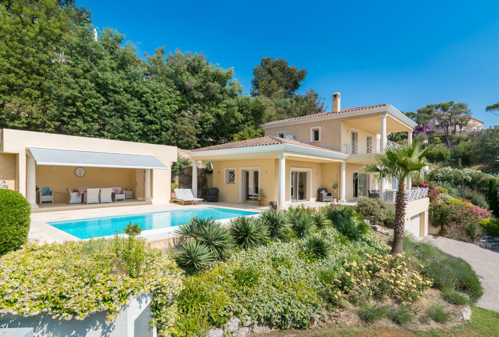 Sur les collines de Mandelieu, dans un quartier résidentiel, belle villa d'architecture néo-provençale profitant d'un superbe panorama sur la mer, avec la baie de Cannes et les îles de Lérins à l'horizon.