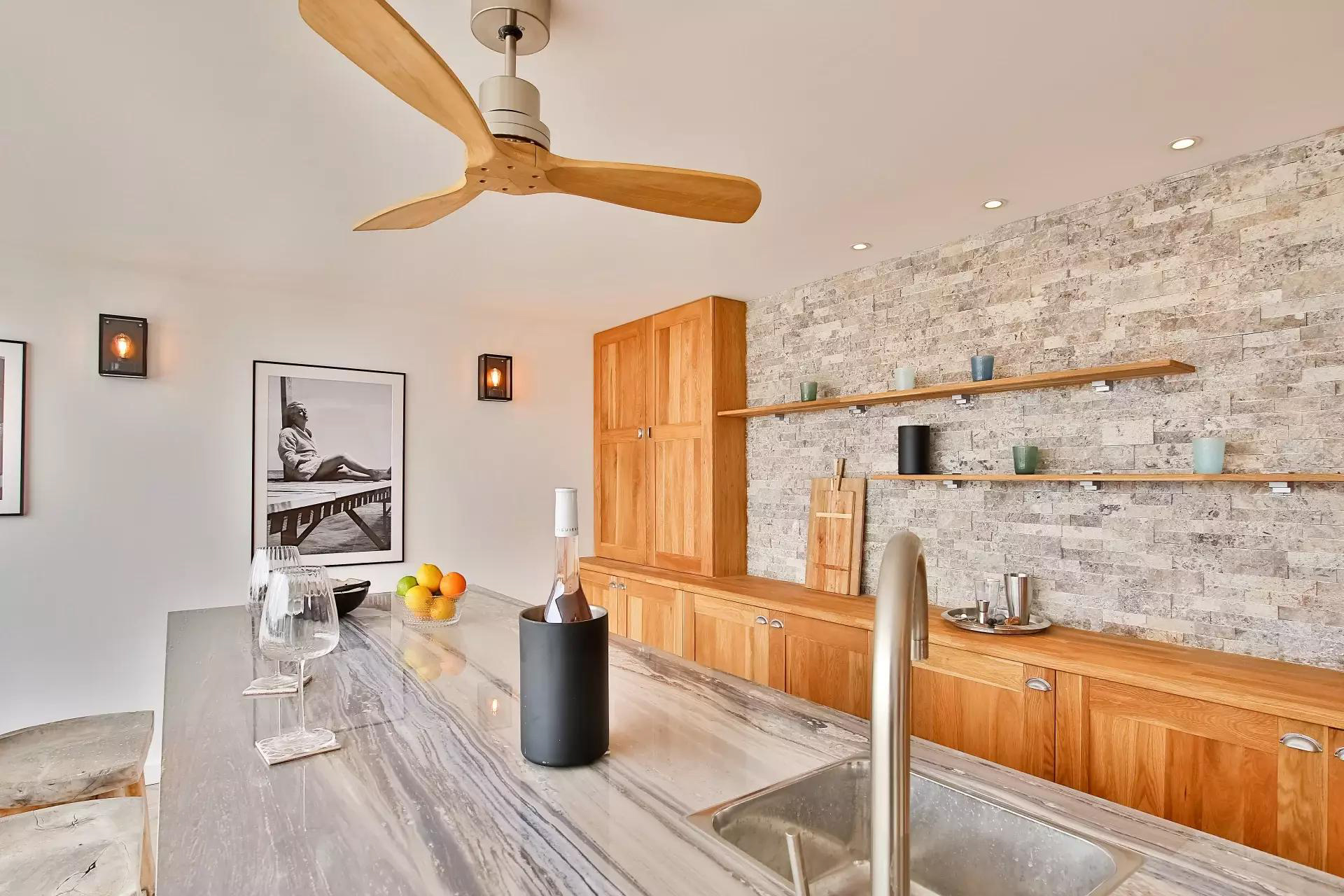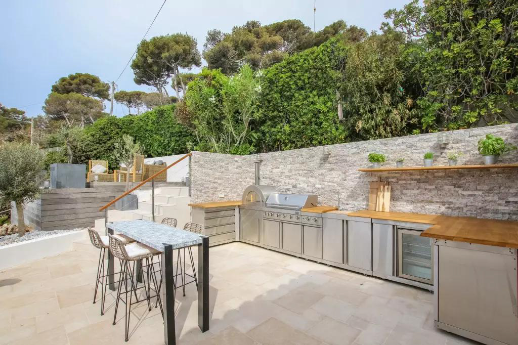 A l'extérieur : terrasse ensoleillée avec solarium, pool house avec cuisine, salle d'eau et wc, espaces verts.