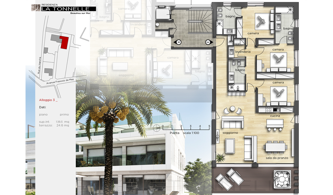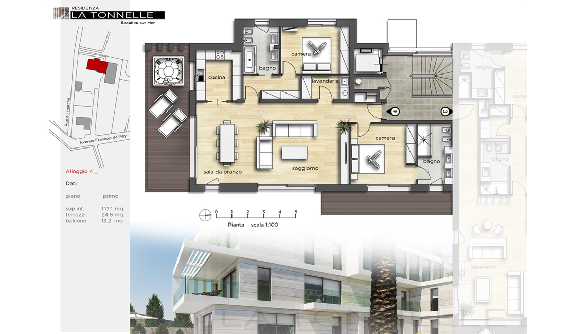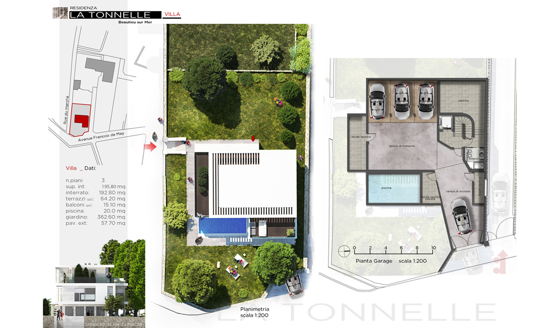 Les deux appartements du premier étage possèdent quant à eux une large et profonde terrasse avec jacuzzi, leur orientation sera tournée vers le parc de la copropriété. Le penthouse occupe toute la surface du dernier étage, l'accès au solarium se fera par un escalier privé depuis la terrasse de l'appartement. Les édi ces, de ligne résolument moderne béné cieront de toute la domotique et des dernières technologies a n d'offrir a ses occupants tout le confort moderne (terrasses avec brise soleil directionnels). Toutes les terrasses et jardins privatifs seront tournés vers le parc arboré de la copropriété, l'éclairage naturel externe et LED a été étudié a n de créer un jeu d'ombres et lumières particulièrement impressionnant. L'accès voiture se fera par la rue François de May pour l'immeuble et la villa. Les occupants traverseront le parc arboré avant d'arriver au sous sol où se trouveront les garages et toutes les parties techniques. Un ascenseur et un escalier de service permettront de rejoindre les différents appartements.