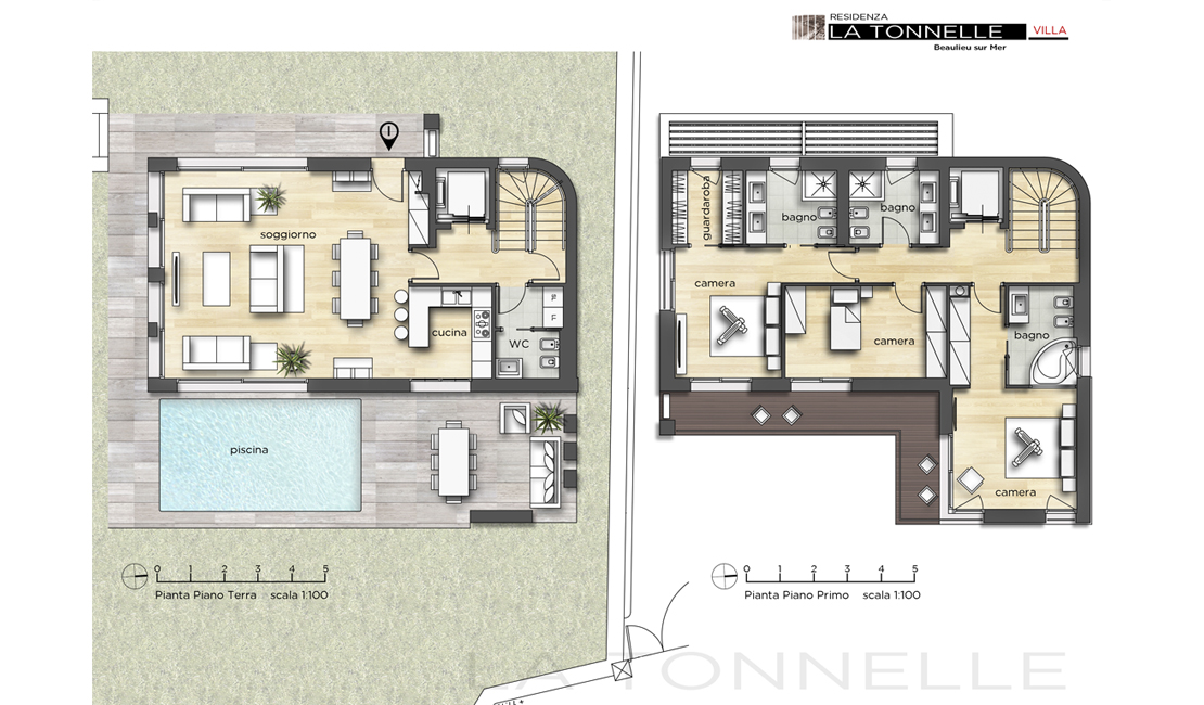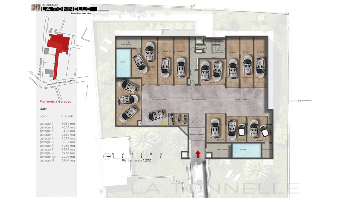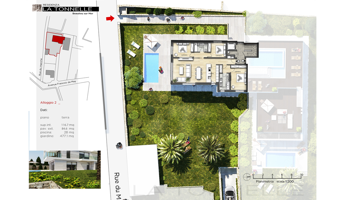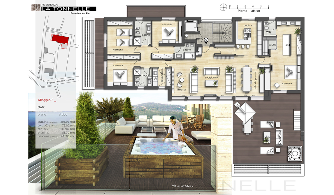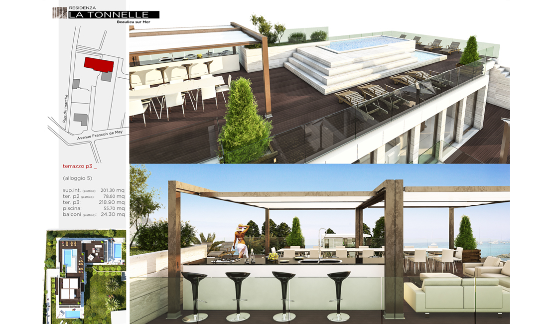 La résidence "La Tonnelle" consiste en la construction d'une villa indépendante et d'un petit immeuble collectif comprenant cinq appartements chacun disposant de vastes terrasses, piscine privée pour les rez-de-jardin, jacuzzi pour les premiers étages et un magni que penthouse avec solarium et piscine sur le toit. Les deux rez-de-jardin possèdent chacun un jardin à usage privatif ainsi qu'une piscine privée dans la continuité de la partie habitable ce qui permet de créer un espace unique entre zone intérieure et extérieure.
