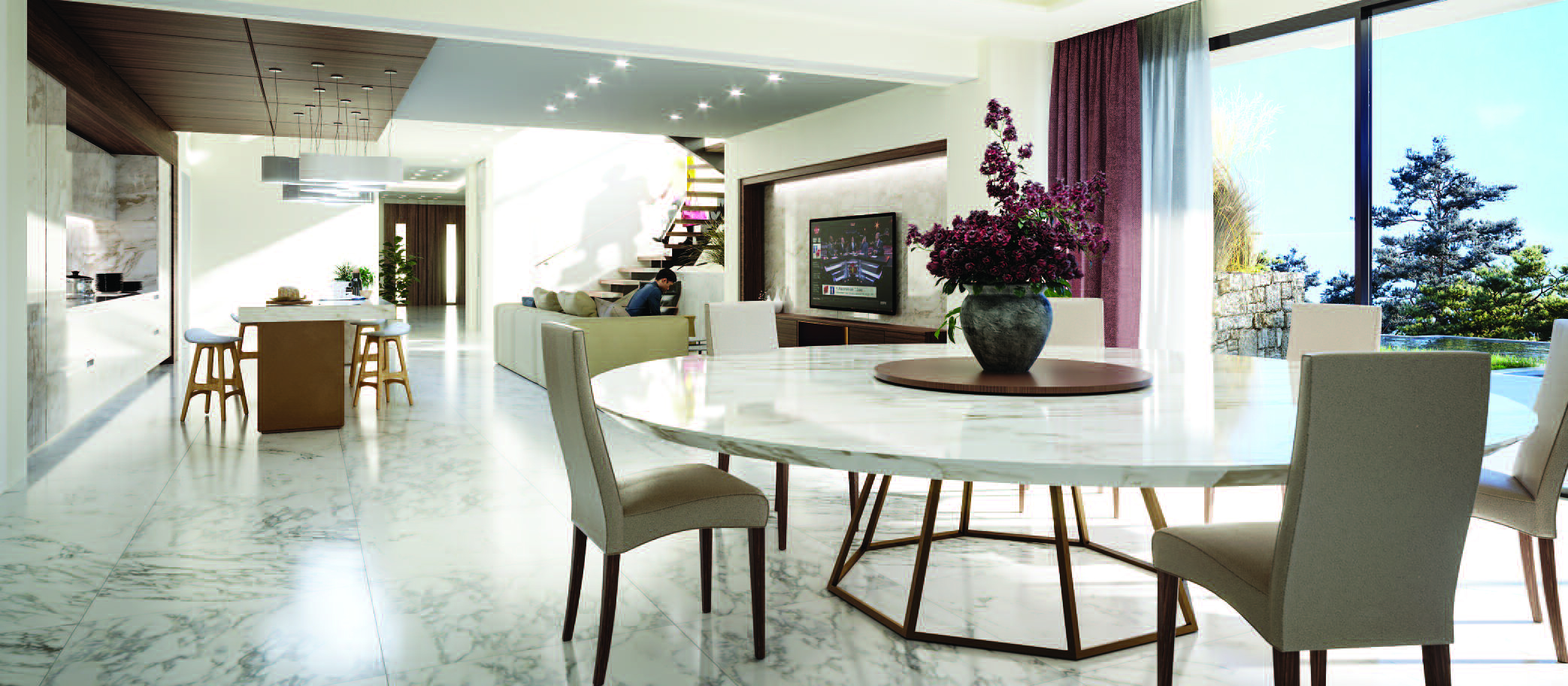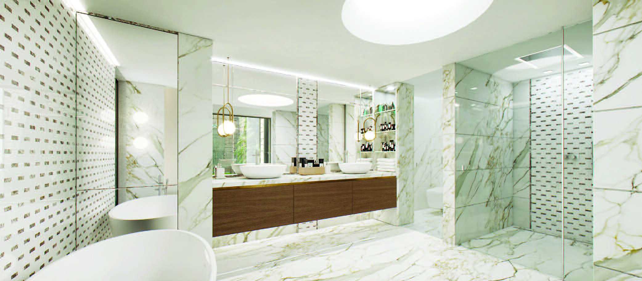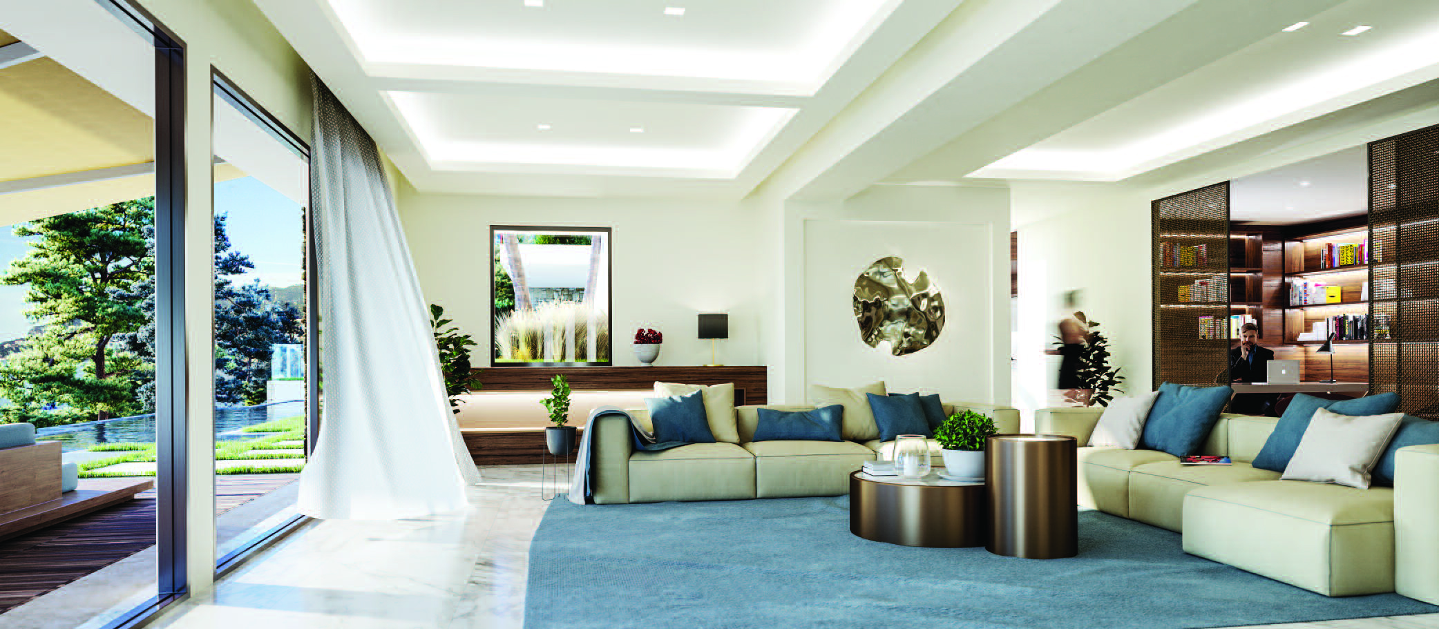 Sols en marbre de Carrare beige crème, canapés confortables vous envelopperont et un éclairage tamisé vous détendra !