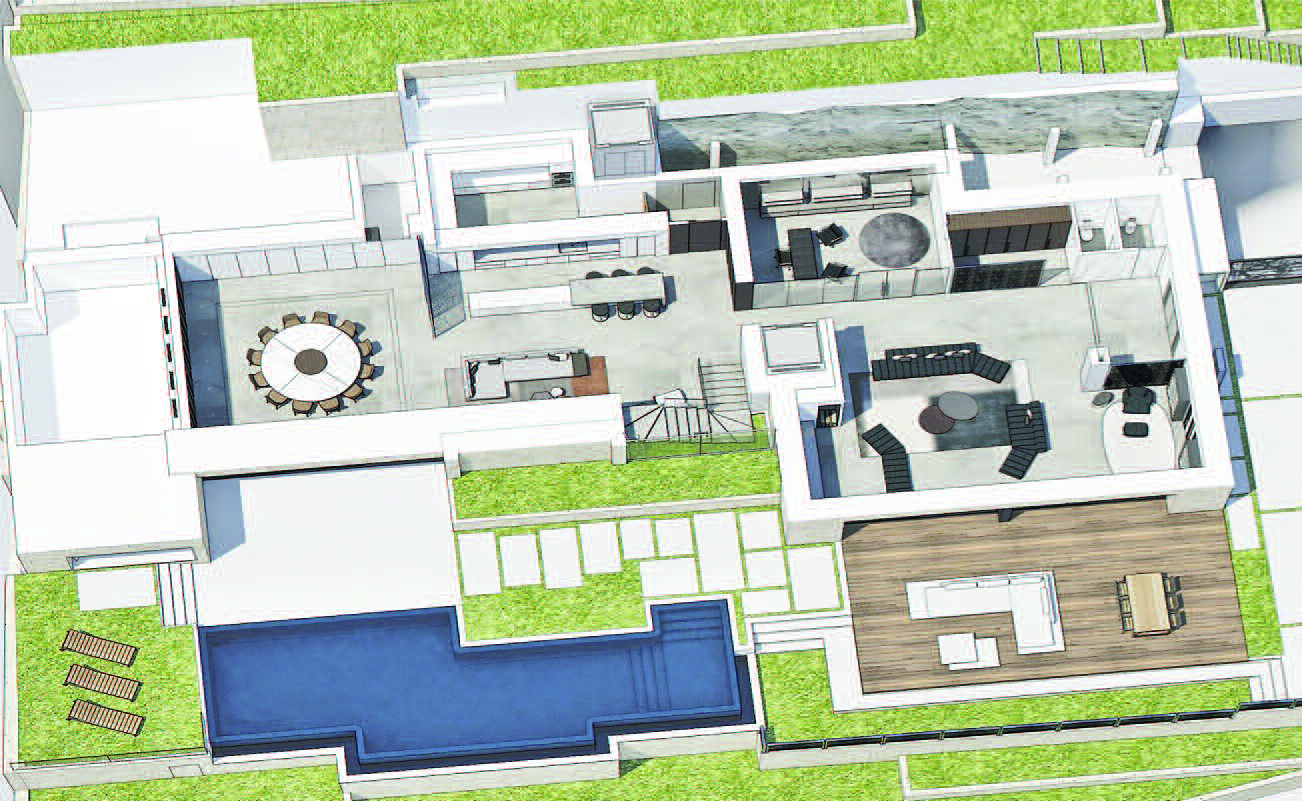 Un écran géant avec scène pour DJ ou musiciens le soir peut aussi faire office de terrasse avec transats, légèrement surélevée au-dessus de la piscine en journée. Et une immense piste de danse entourée de nombreux sièges confortables pour ceux qui regardent et se prélassent, se transformant en une salle à manger « extérieure » ombragée pendant la journée.