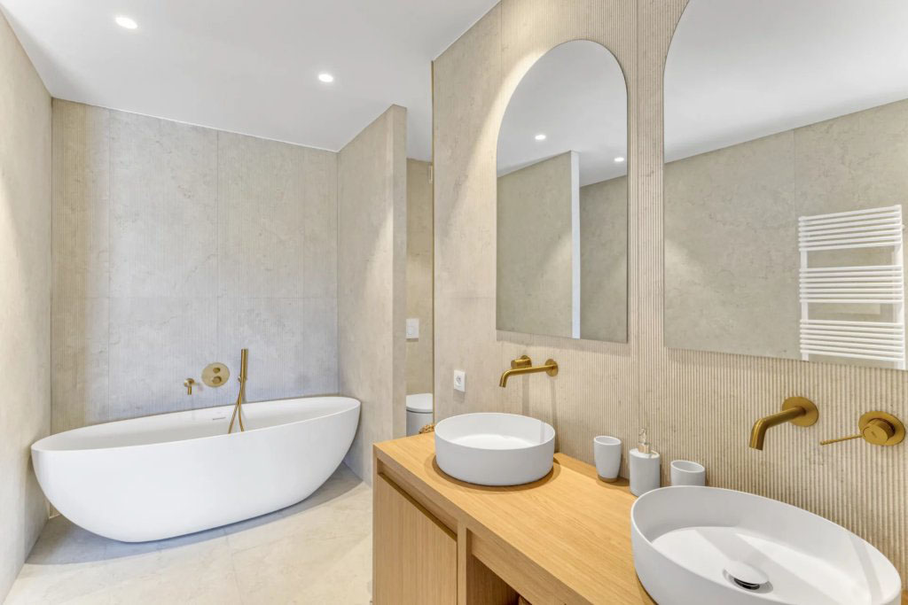 Le séjour lumineux de 70 m2 s'ouvre sur la cuisine américaine, créant un espace convivial et sophistiqué.