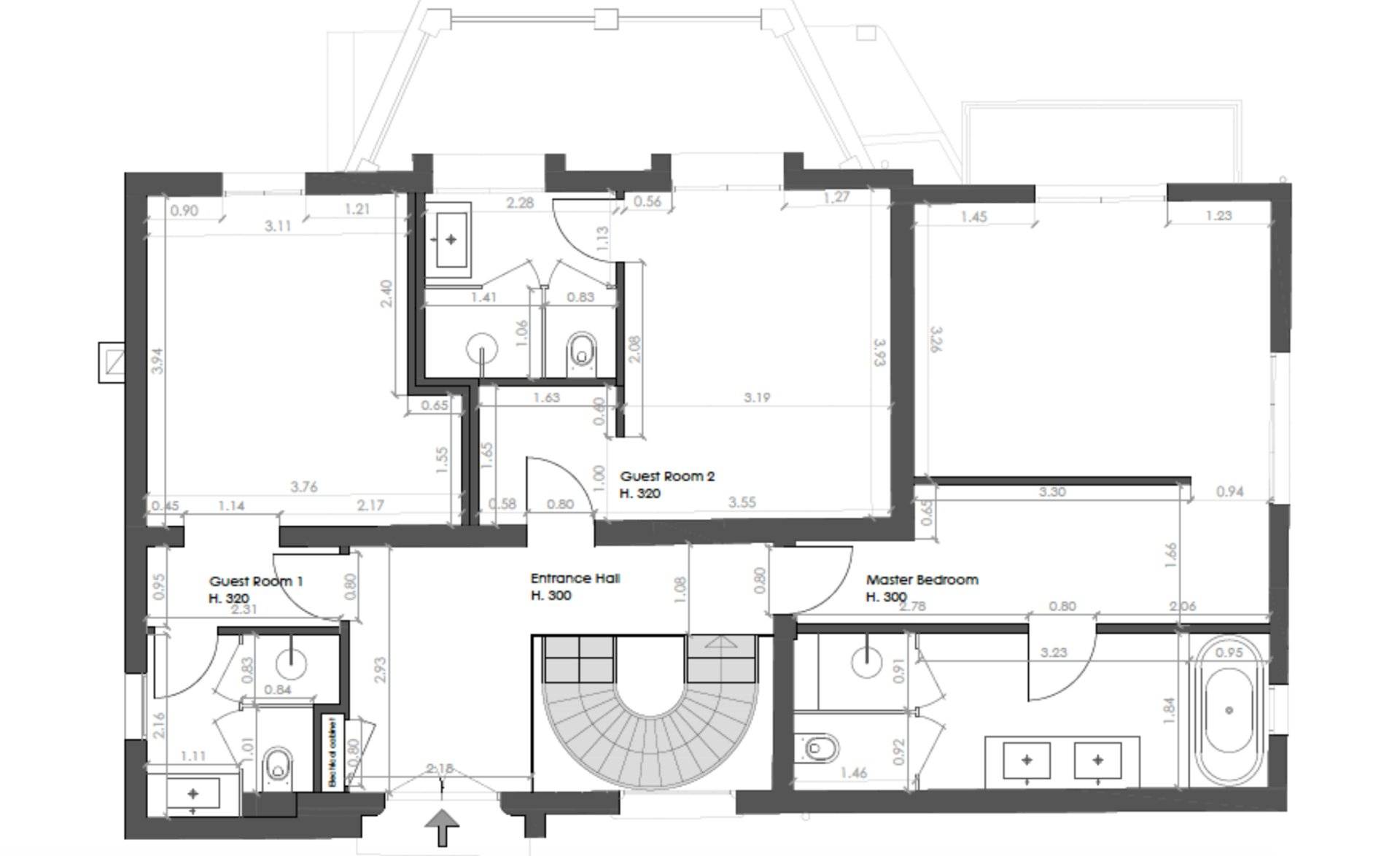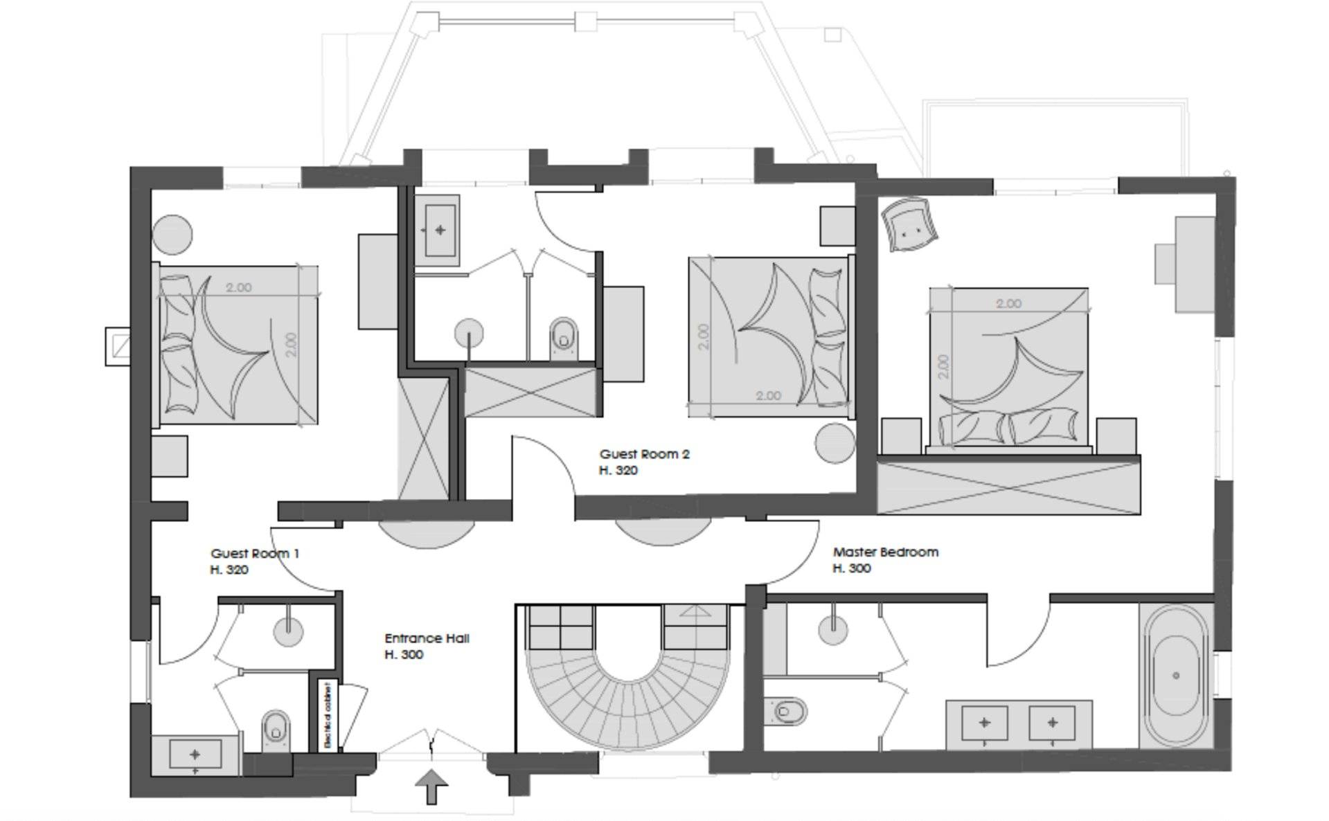 Niveau supérieur : 3 chambres avec salle de bains, bureau, terrasse.