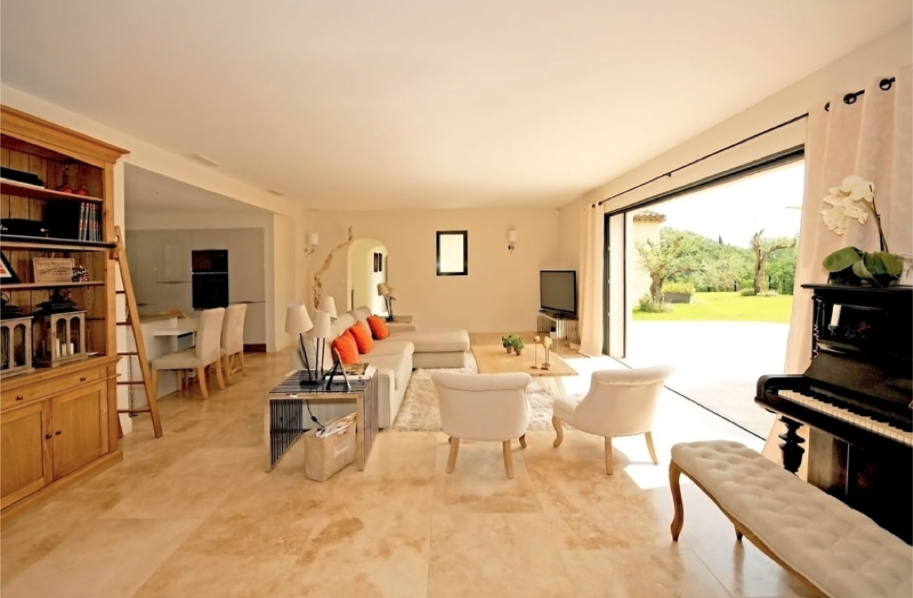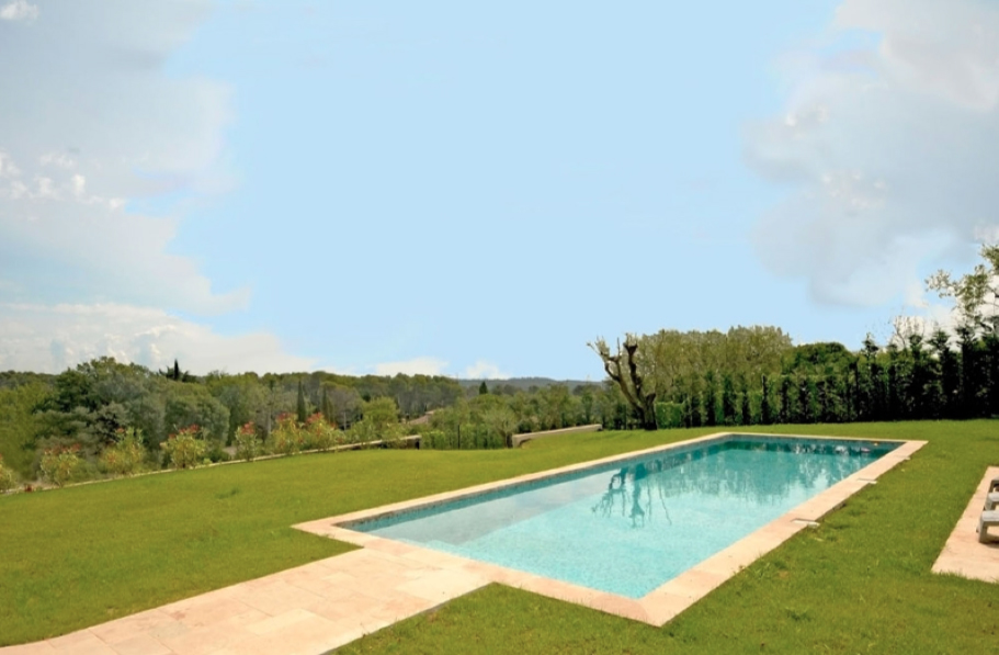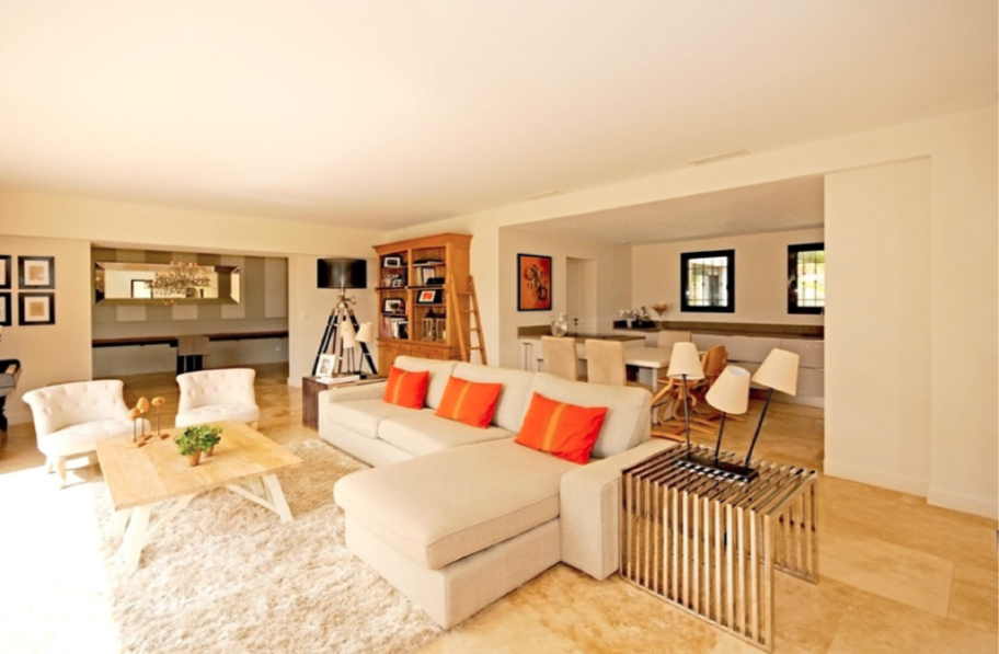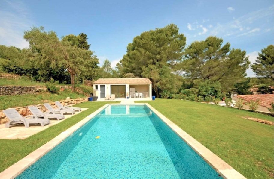 Mougins: quartier résidentiel à proximité des écoles et des commerces internationaux, superbe villa en rez-de-chaussée, totalement rénovée avec un très haut standing, orientée plein sud et offrant un hall d'entrée, un grand salon lumineux ouvrant sur une belle terrasse, Ouvert luxueux cuisine entièrement équipée avec un cellier et une buanderie, salle de cinéma maison, 4 chambres dont une spacieuse chambre à coucher principale avec dressing, 3 salles de bains. Terrain paysagé d'environ 2300m2 avec belle piscine, pool house et maison d'amis avec cuisine d'été et salle d'eau. Nombreux parkings