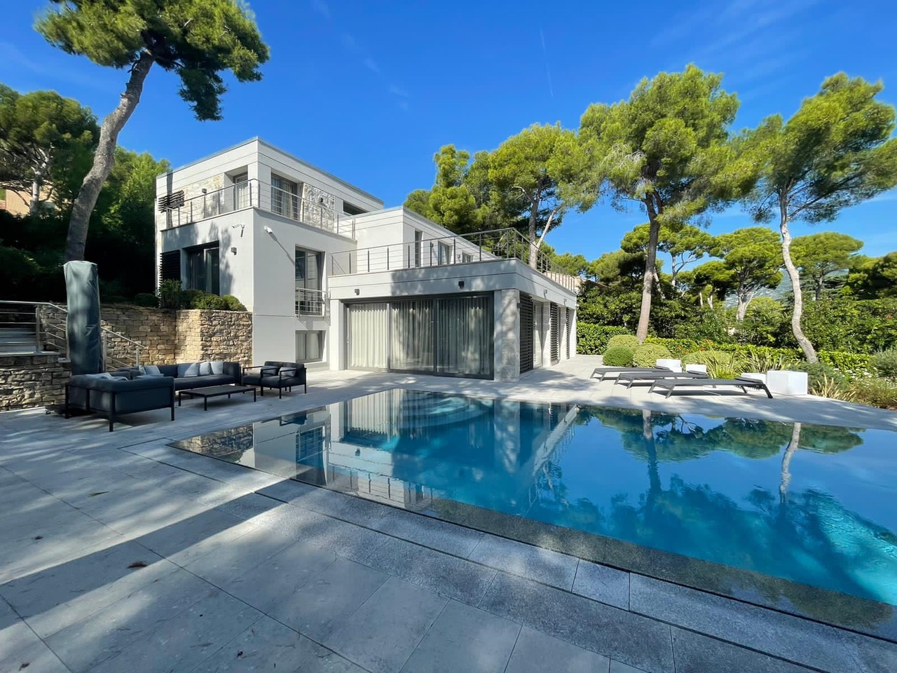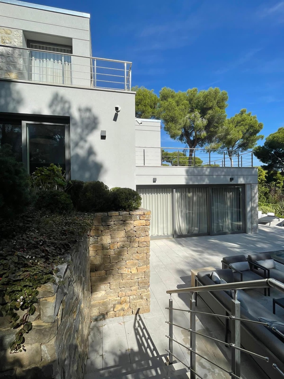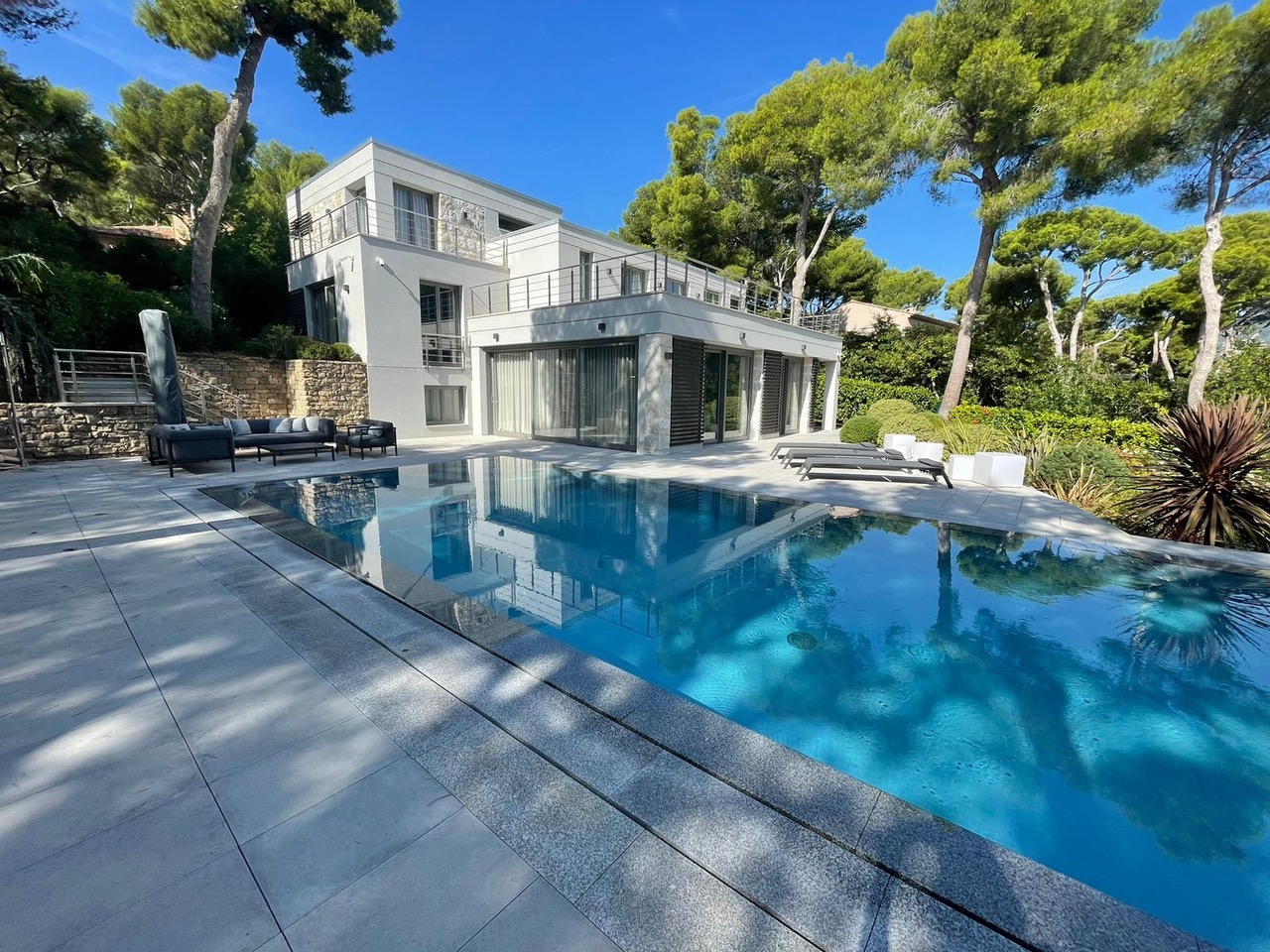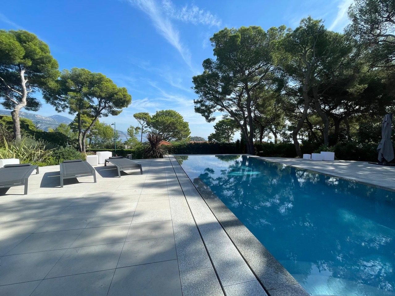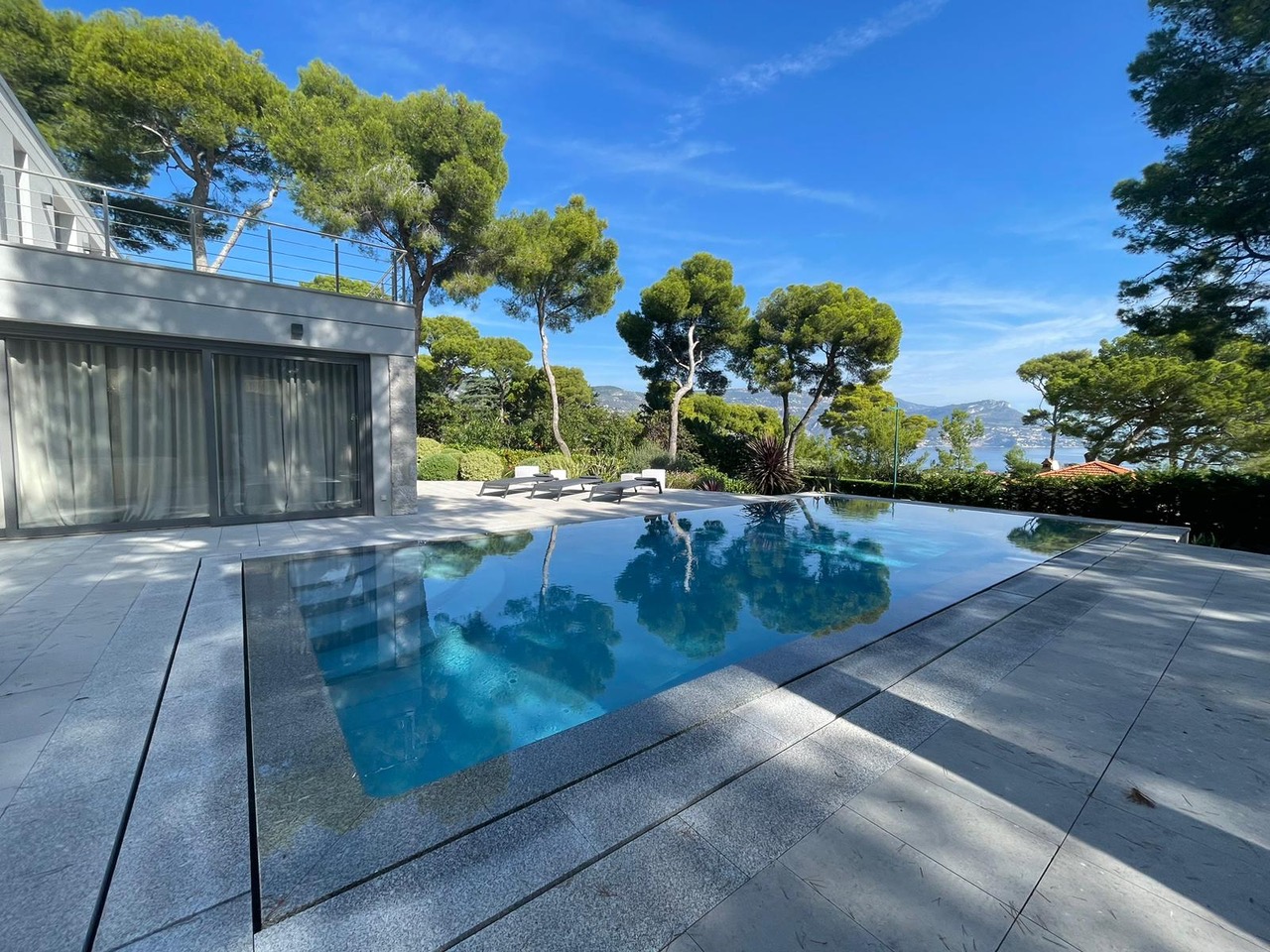 Sur le côté Est de la presqu'île du Cap Ferrat avec vue sur Monaco, la Riviera Italienne et la Baie de Fosse, villa neuve après une rénovation totale sur un terrain plat de 15 ares avec accès pratique et parking pour plusieurs voitures.