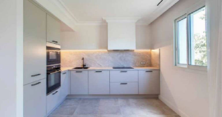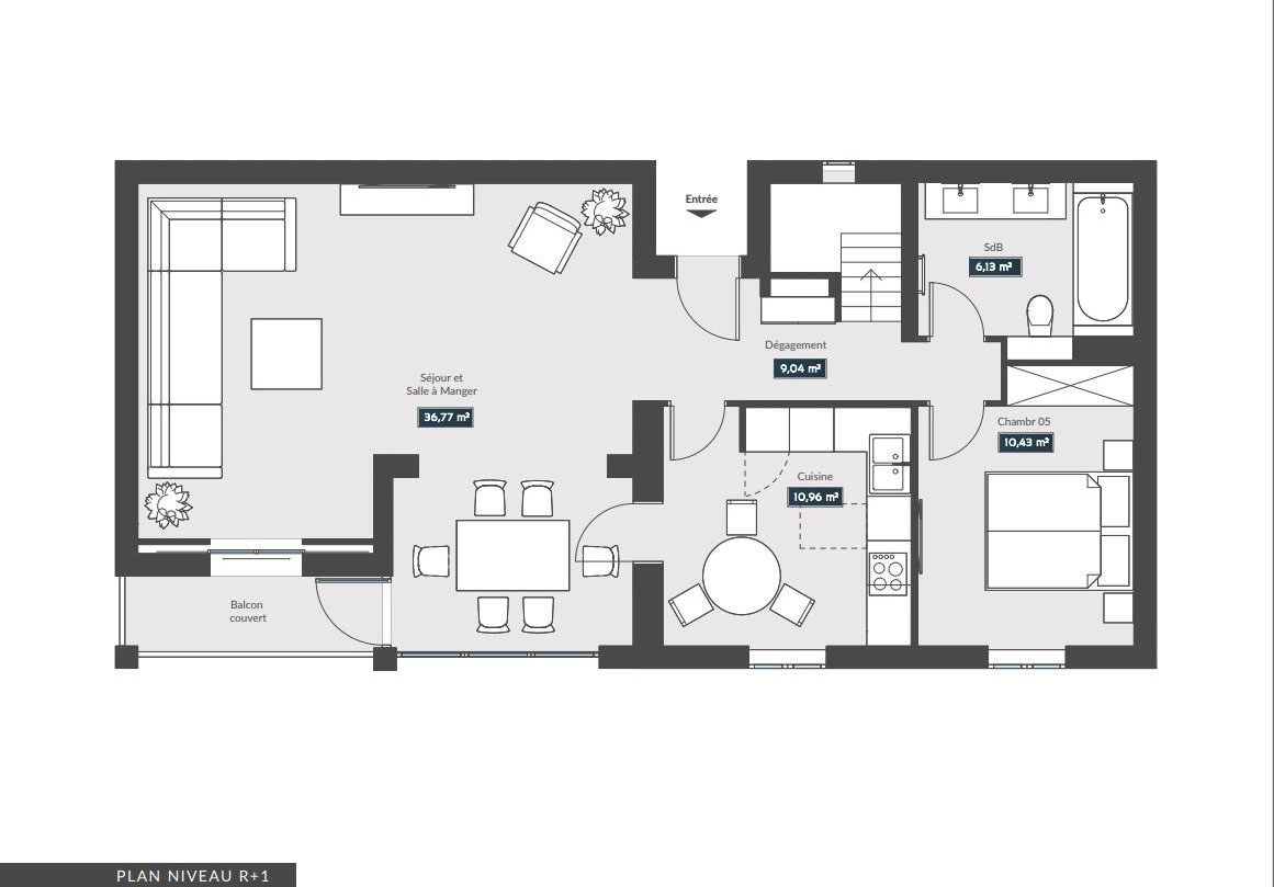 Double séjour, cuisine séparée équipée, une chambre avec salle de bains.