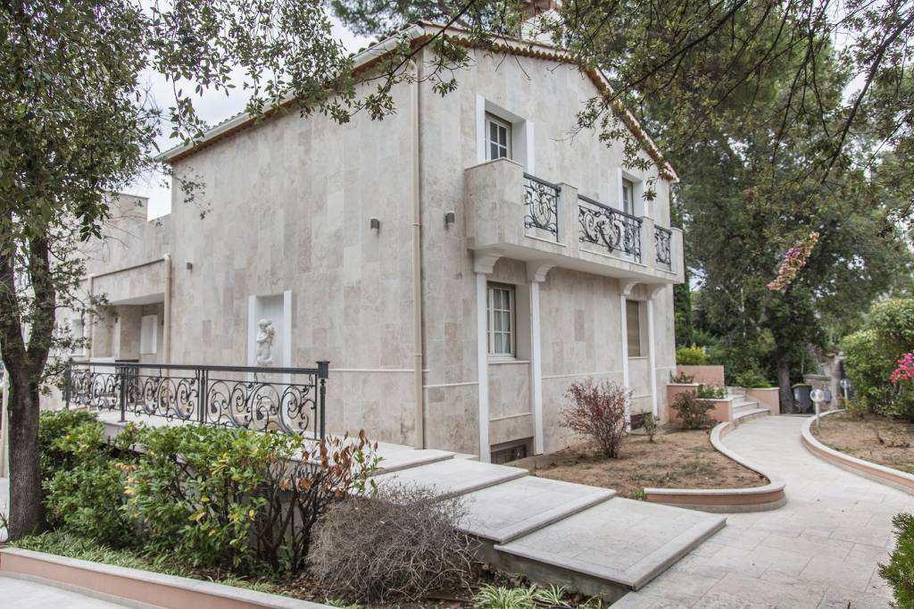 Bardage extérieur en marbre rose, porte blindée, double vitrage, climatisation réversible, alarme, ascenseur intérieur, beau jardin, 2 places de parking.