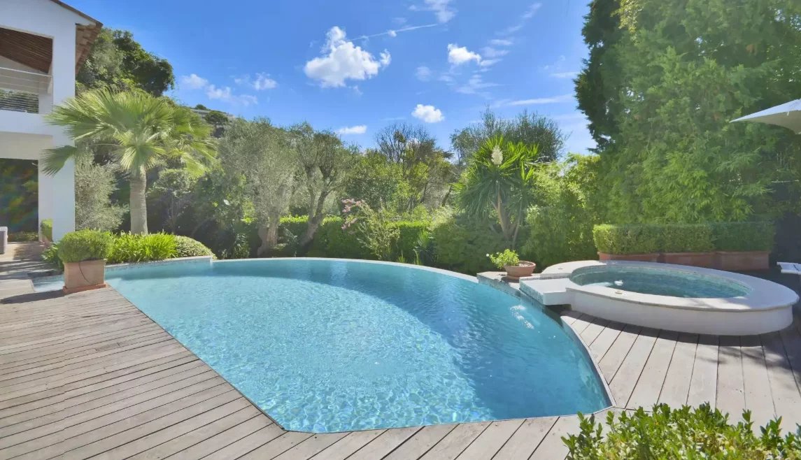Jardin arboré de 1034 m2 avec piscine et jacuzzi.