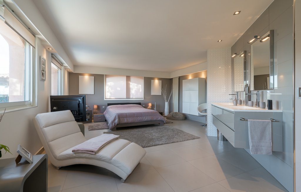 Edifiée sur un terrain de 1740 m2, la villa totalise une superficie d'environ 320 m2 répartie sur 3 niveaux, avec notamment 4 suites et un bureau.
