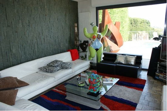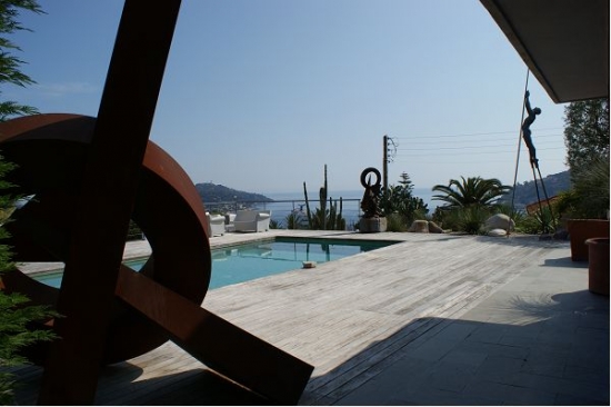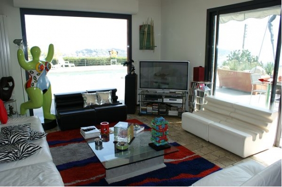 При в ходе в дом мы попадаем в большую прихожую, налево из которой открывается просторная гостиная, разделённая на 2 зоны: столовая с красивым современным стеклянным столом, за которым свободно размещаются 8 персон и гостиная с удобной кожаной мебелью, большим телевизором и множеством скульптур и картин известных художников. Комната имеет большие панорамные окна с видом на бассейн и море, а также выход на роскошную террасу с изумительным морским видом, со вкусом обставленную удобной мягкой мебелью. На террасе расположен красивый бассейн, окружённый шезлонгами, а также большое барбекю.