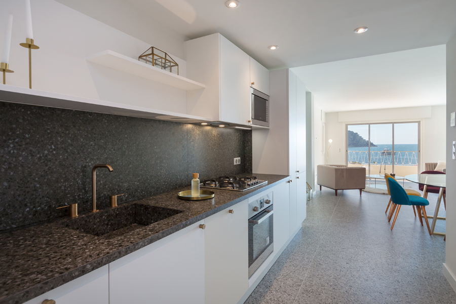 Квартира состоит: гостиная, столовая, оборудованная кухня, 2 спальни, ванная комната, гостевой туалет, терраса 21 кв.м. с видом на море, подвал, комната для прислуги 14 кв.м.