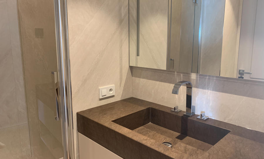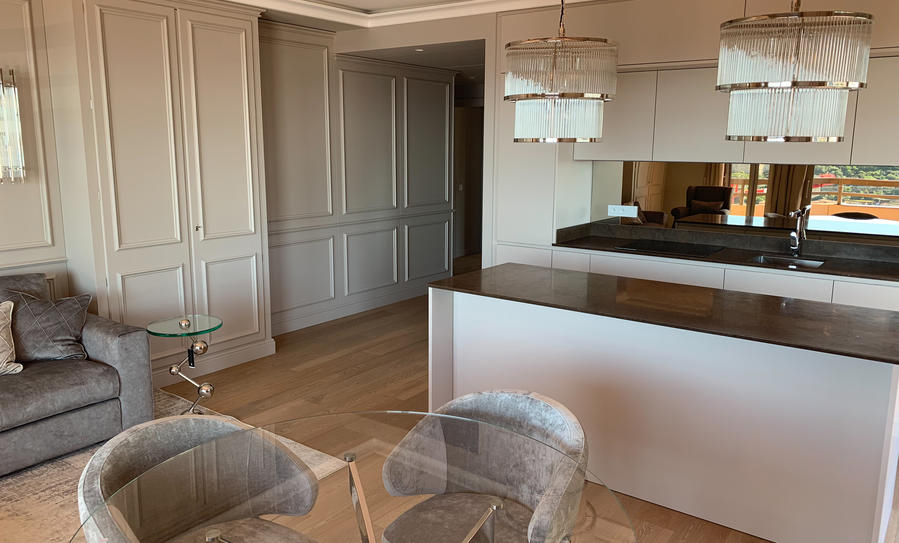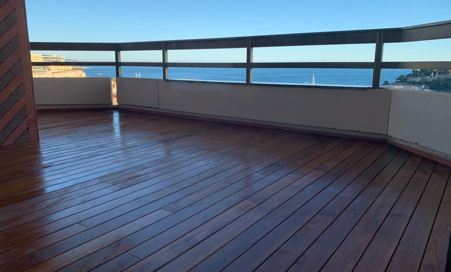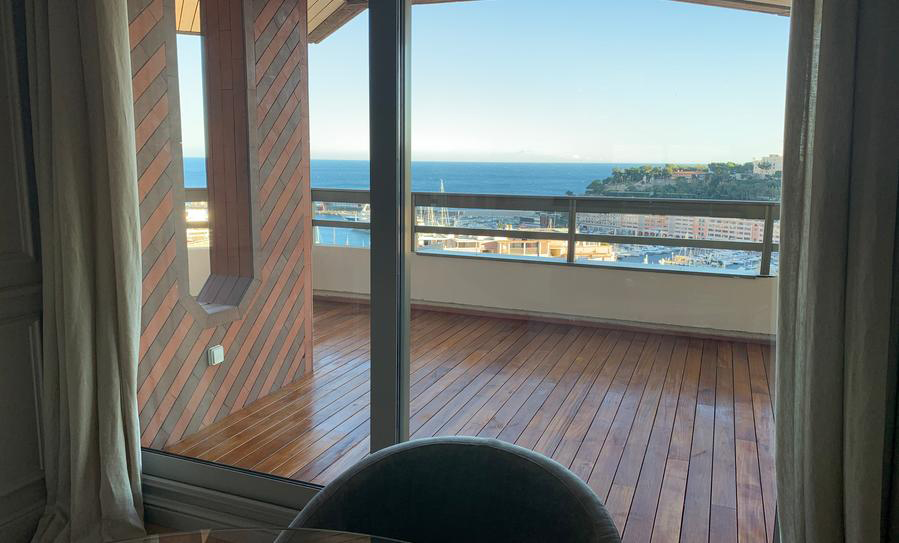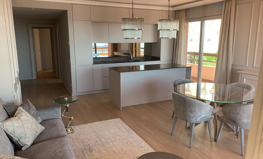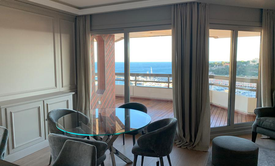 Полностью отремонтированная квартира с большими террасами и видом на порт Монако, море и княжество. Ее отделка роскошная: массивный паркет, изделия из дерева, американская кухня с центральным островом, мрамор для ванных комнат, кондиционер и т.д.