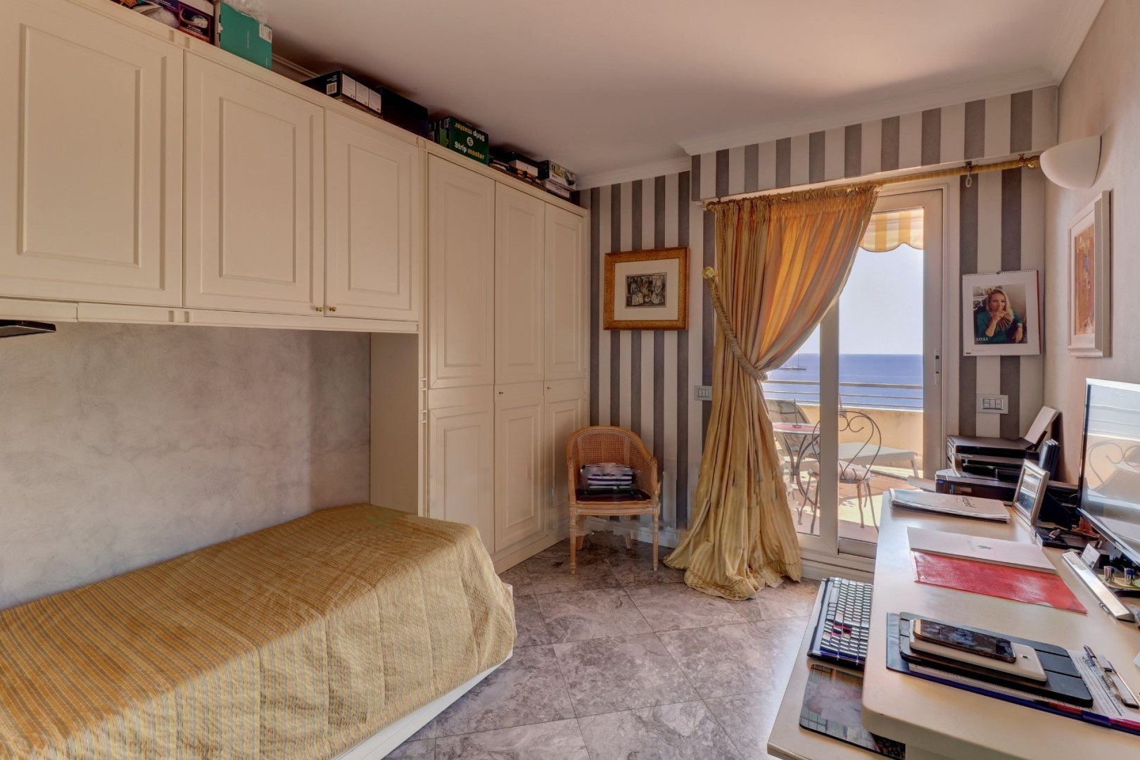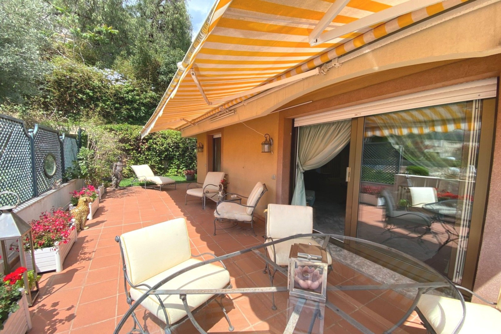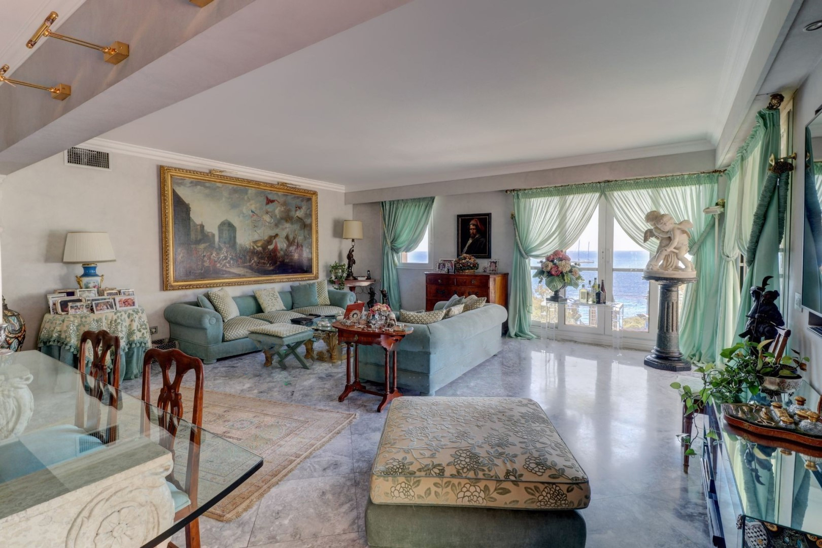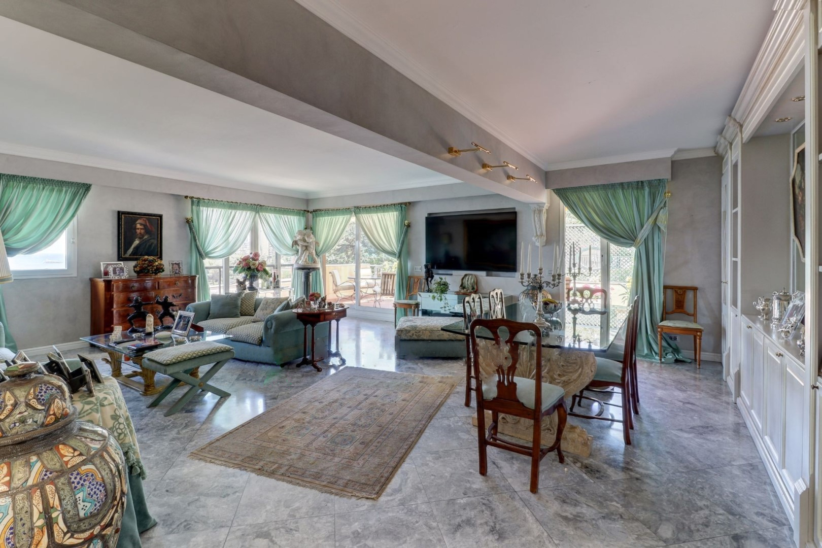 Квартира выглядит следующим образом: прихожая, большая гостиная с выходом на террасу площадью 47 м² и сад площадью 26 м² с прекрасным видом на Средиземное море и Монако, отдельная кухня, две спальни, ванная комната и столовая.