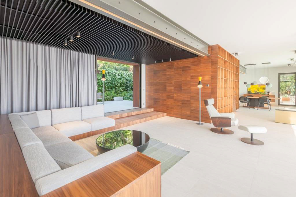 Приемная открытой планировки выходит на террасы из натурального камня по обеим сторонам виллы, создавая ощущение огромного пространства: южная сторона окружена пейзажным бассейном, а северная сторона окружена лесом, обеспечивающим естественную тень.