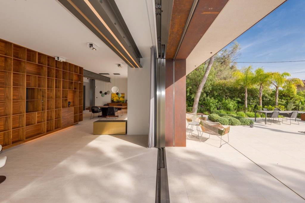 Современная сауна была незаметно встроена под террасу у бассейна с соснами. Полностью оборудованная высокотехнологичная кухня выходит на крытую и открытую обеденные зоны в конце гостиной.