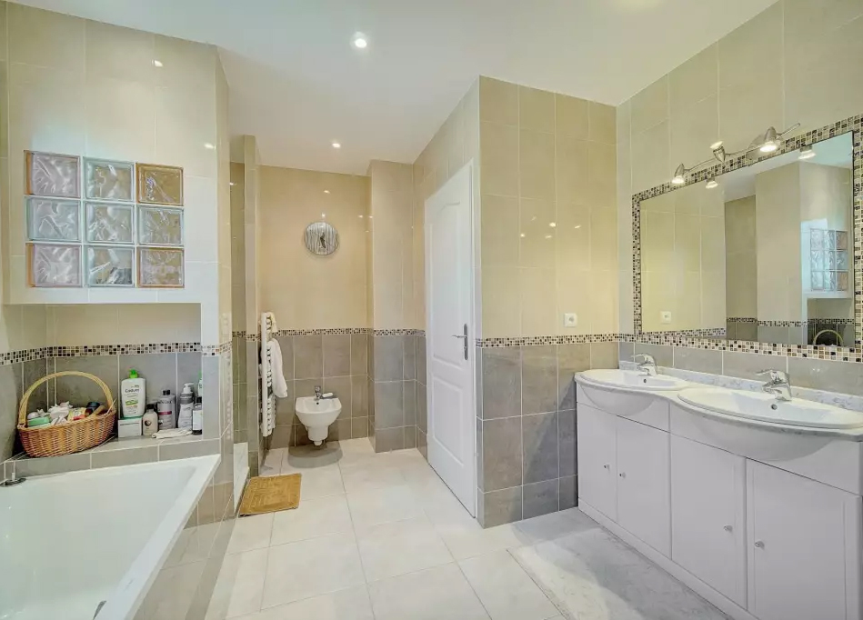 Также имеется 2 спальни с собственными ванной и душевой комнатами, 2 смежные студии с отдельным входом, игровая комната, винный погреб в подвале, закрытый гараж на 3 автомобиля + парковочные места.