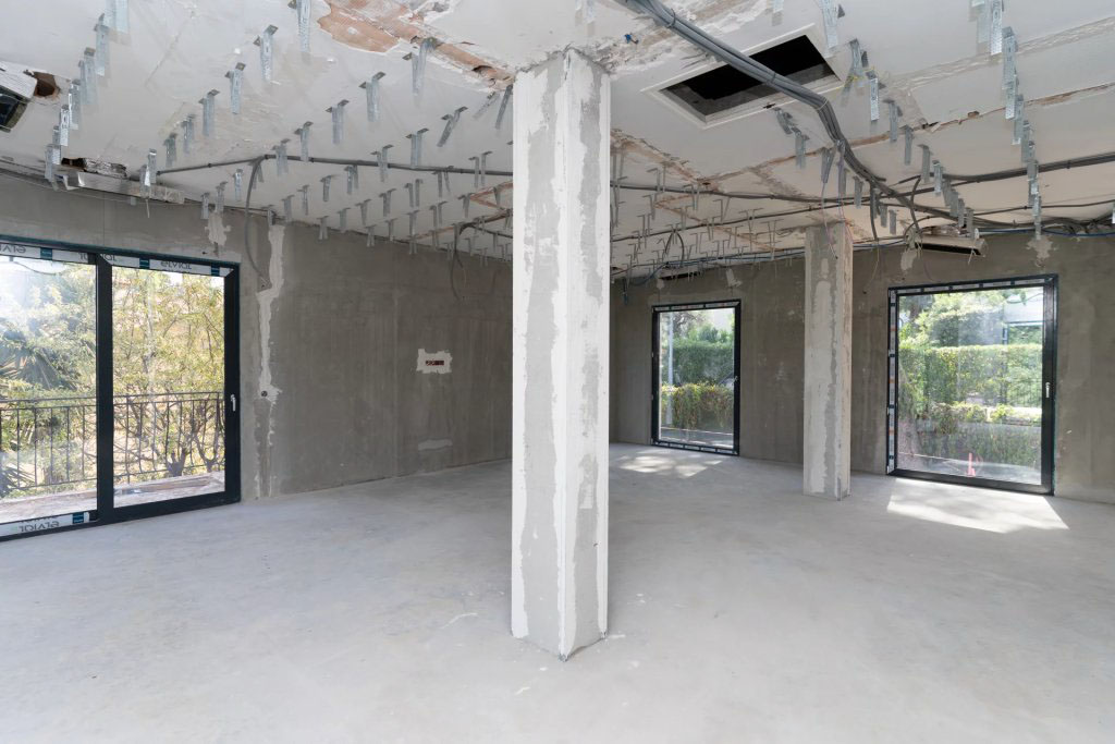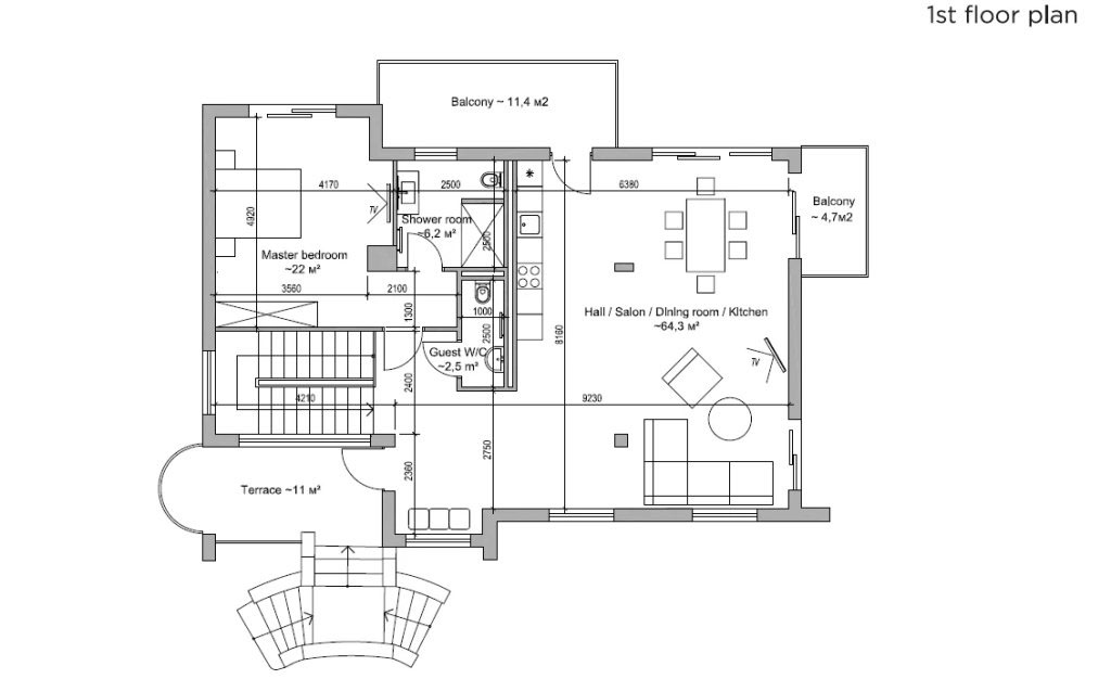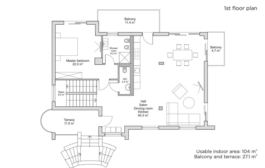 Холл, ведущий в большую гостиную/столовую площадью 64,3 м² с американской кухней, выходящей в гостиную, главную спальню площадью 22 м² с прилегающей душевой комнатой, гостевой туалет.