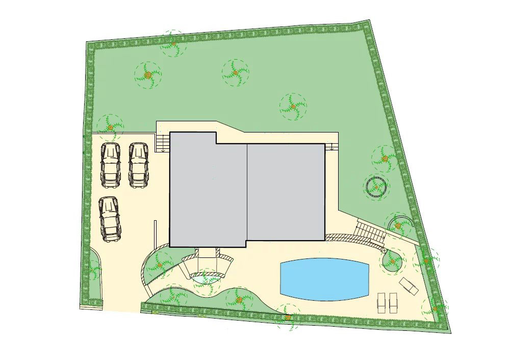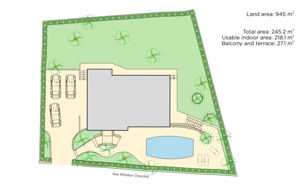 Прихожая ведет в главную спальню площадью 24 м² с прилегающей душевой комнатой, а также в две другие спальни с соответствующими душевыми.
