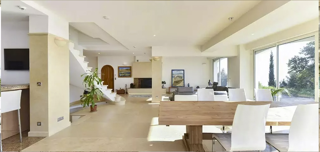 Он состоит из прихожей, большой гостиной площадью 70 м² с камином и видом на море, полностью оборудованной кухни открытой планировки, все с выходом на красивую террасу и в сад, люкса с гардеробной и ванной комнатой, главной спальни наверху, выходящей на террасу с видом на море, фитнес-зала площадью 80 м², офиса и кладовой.