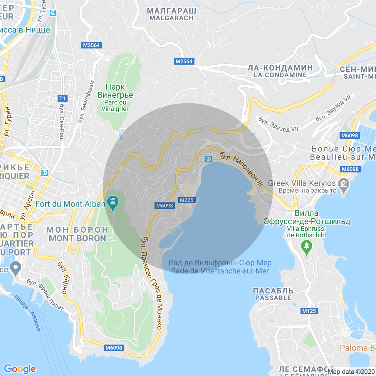 Вилла расположена на вершине Вильфранша в районе Castelet, недалеко от Болье-сюр-Мер - около 7 мин на машине. Превосходный вид, никаких дорог.