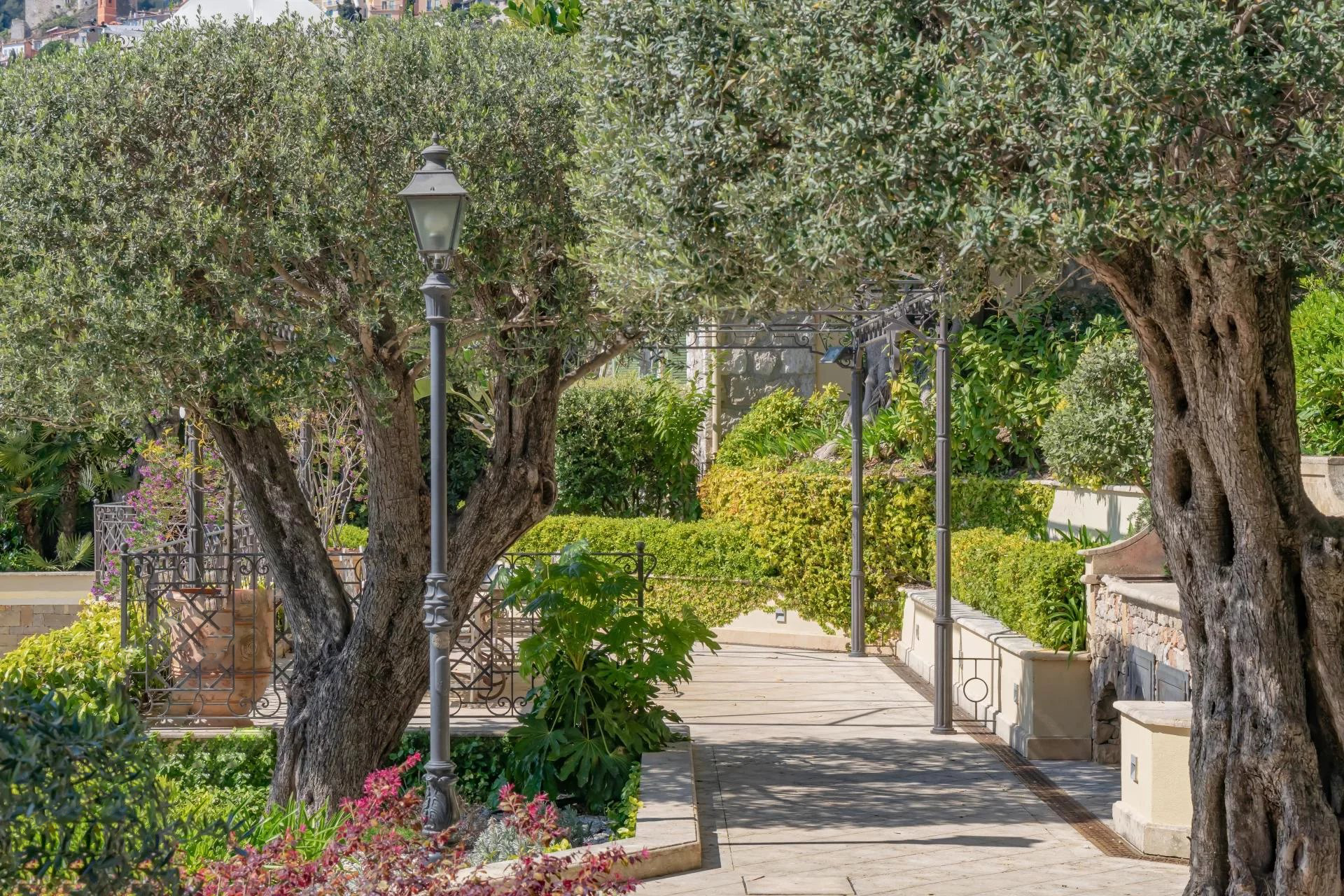 Земля засажена вековыми оливковыми деревьями, средиземноморскими видами, пальмами, клумбами.
