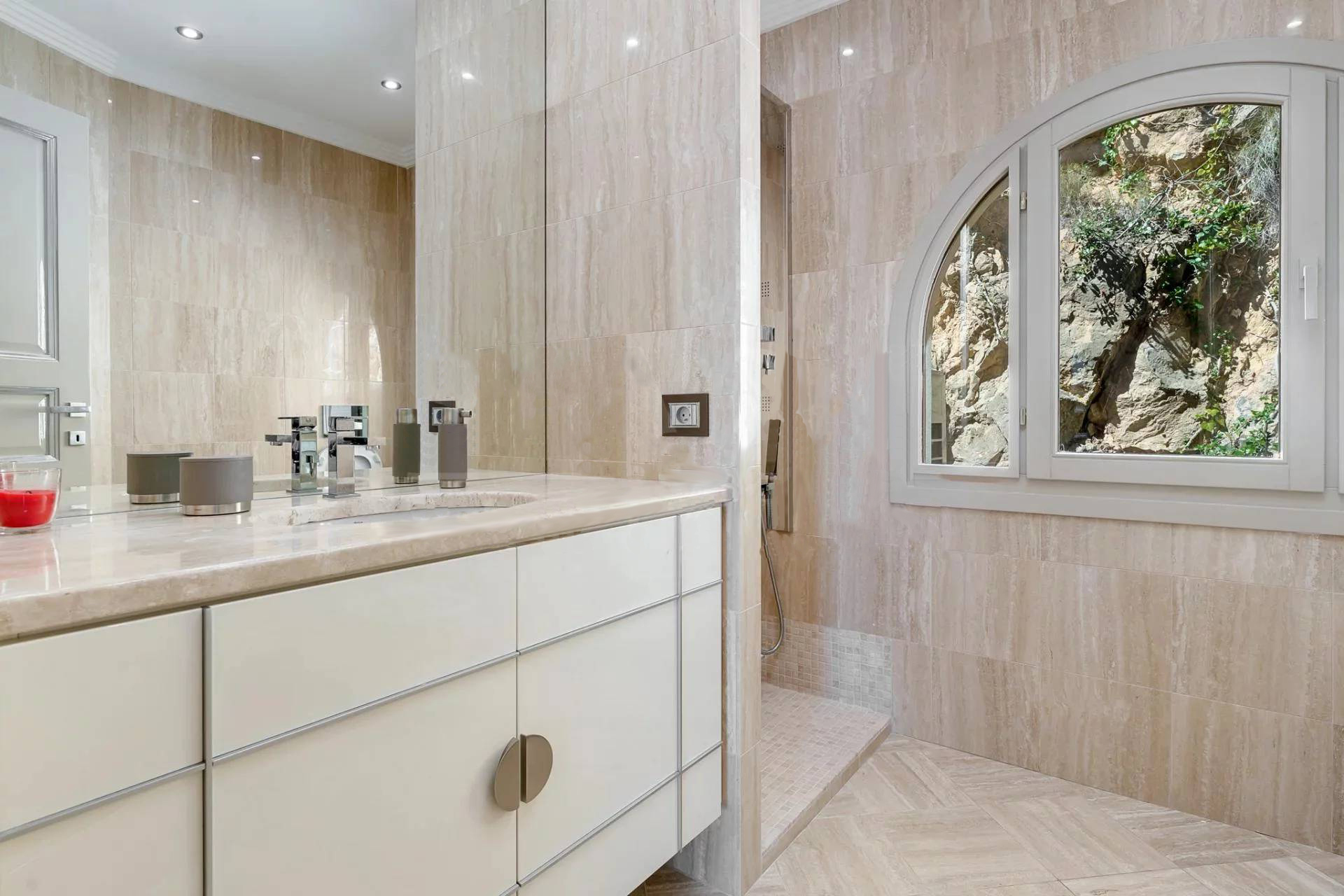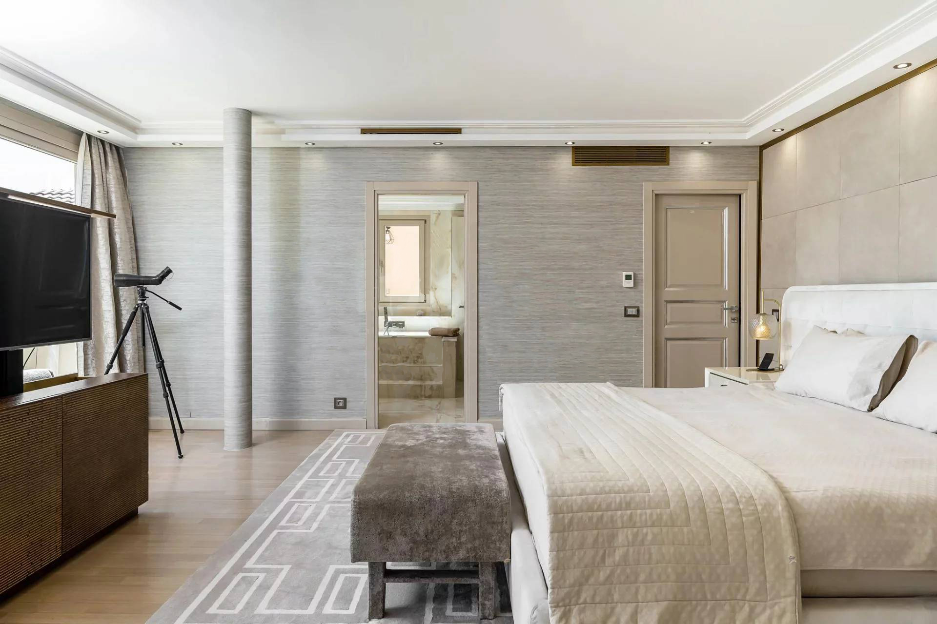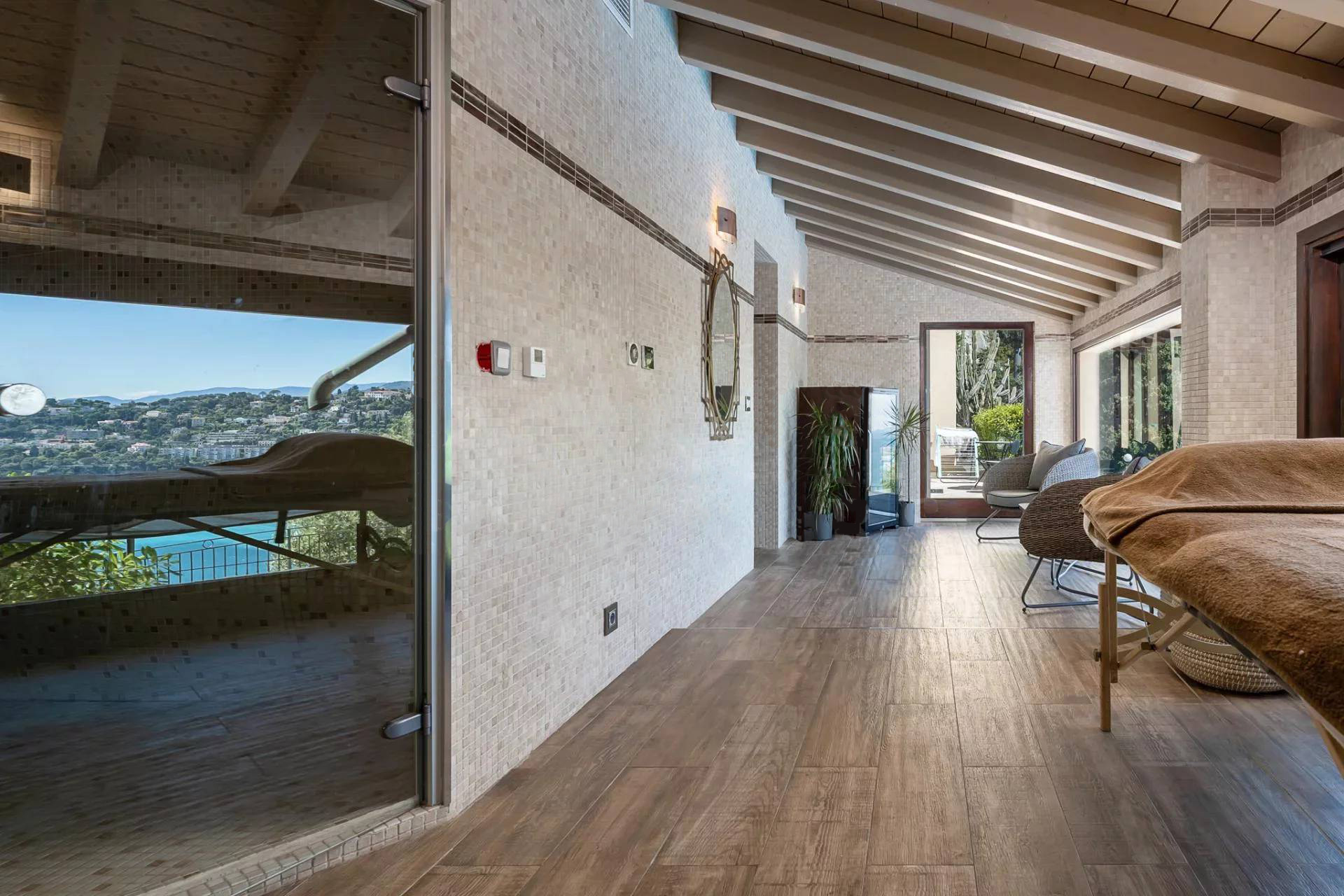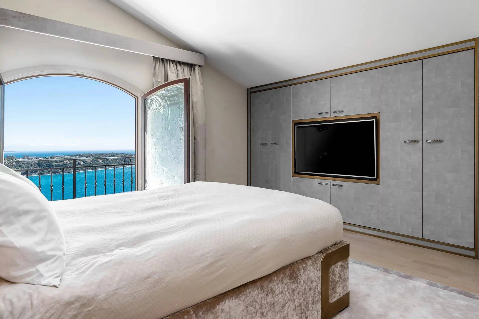 Вилла состоит: гостиная, столовая, кухня, 6 спален, 6 ванных комнат, массажный кабинет, хаммам, солярий, террасы, бассейн. Панорамный вид на море. Кондиционирование воздуха.