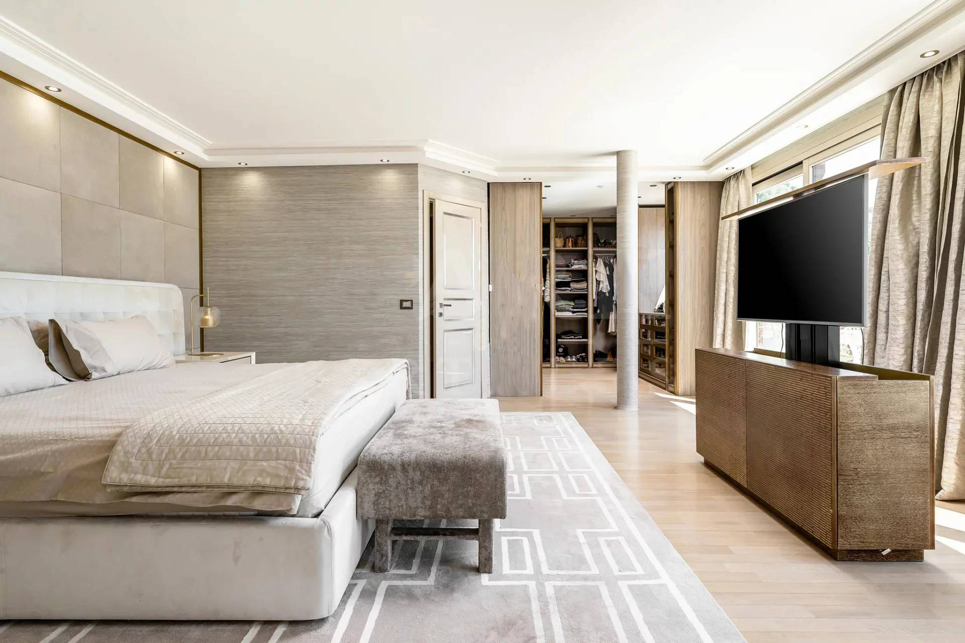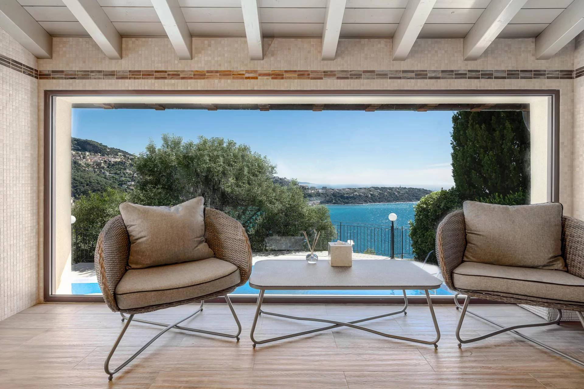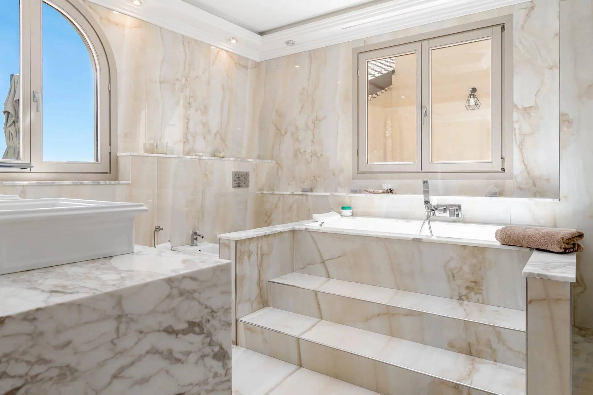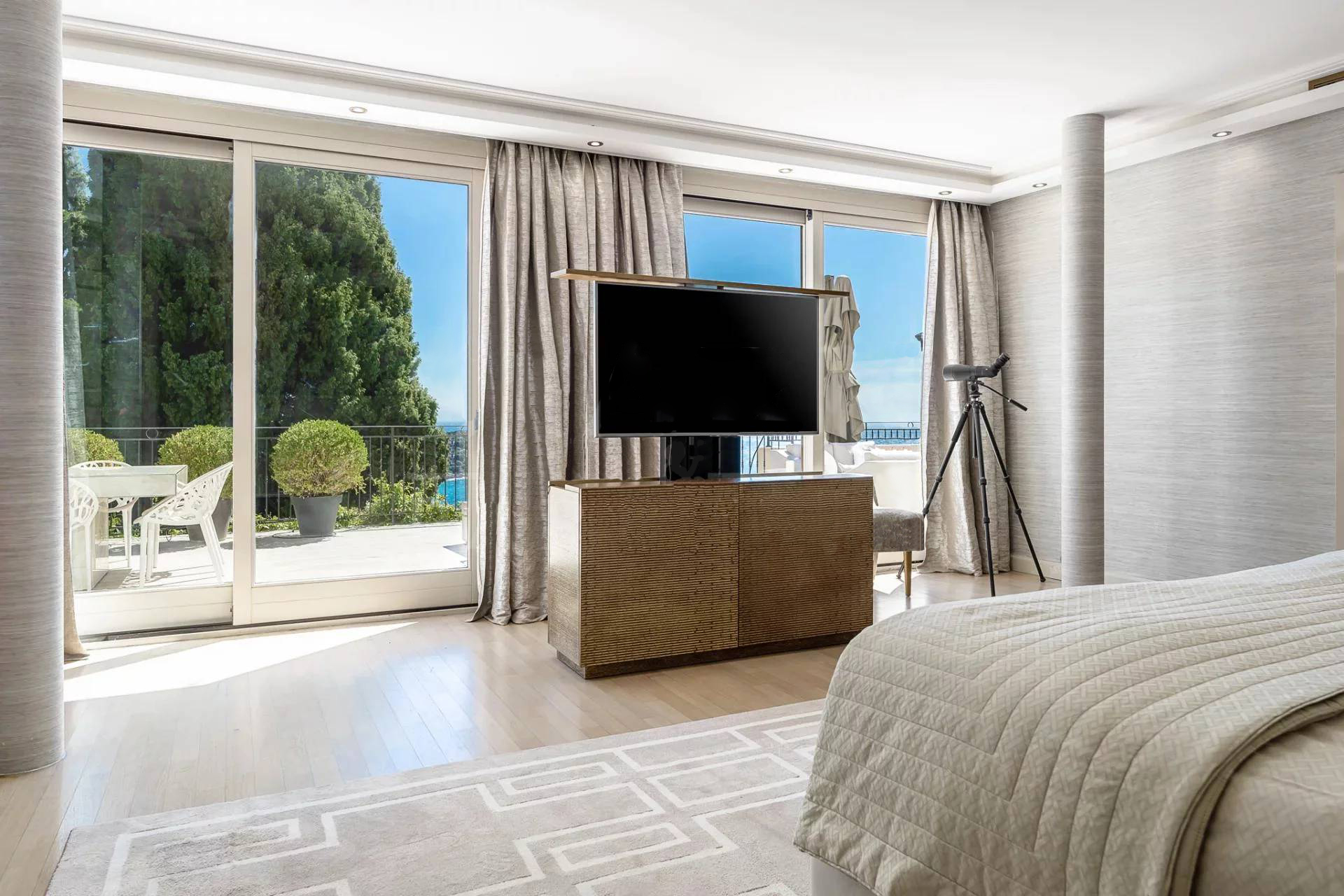 Вилла состоит: гостиная, столовая, кухня, 6 спален, 6 ванных комнат, массажный кабинет, хаммам, солярий, террасы, бассейн. Панорамный вид на море. Кондиционирование воздуха.