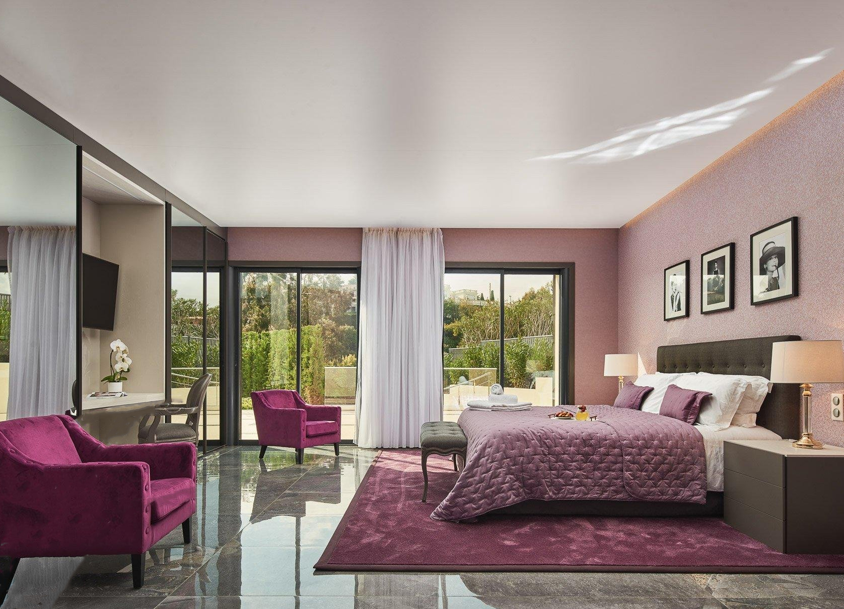 Наверху: три спальни с ванными комнатами, включая две спальни с отдельным входом и террасой.