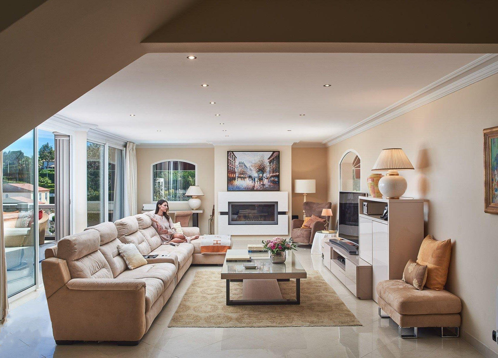 - Гостиная с камином, выходящая на крытую террасу с видом на море и горы