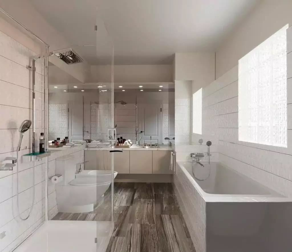 На первом находится большая гостиная 33 м2, отдельная кухня 10 м2 и спальня с душевой комнатой и отдельным туалетом около 20 м2.
