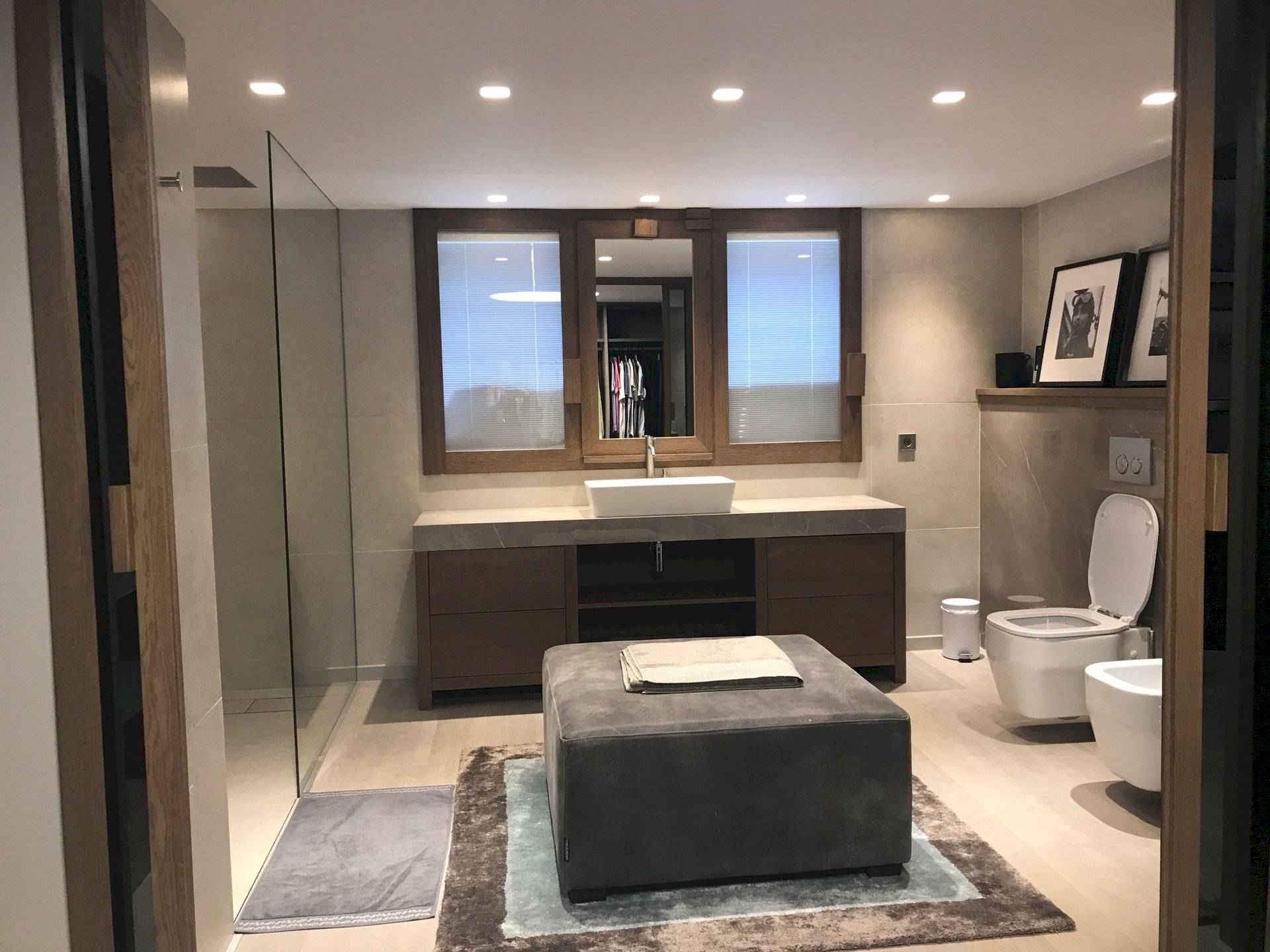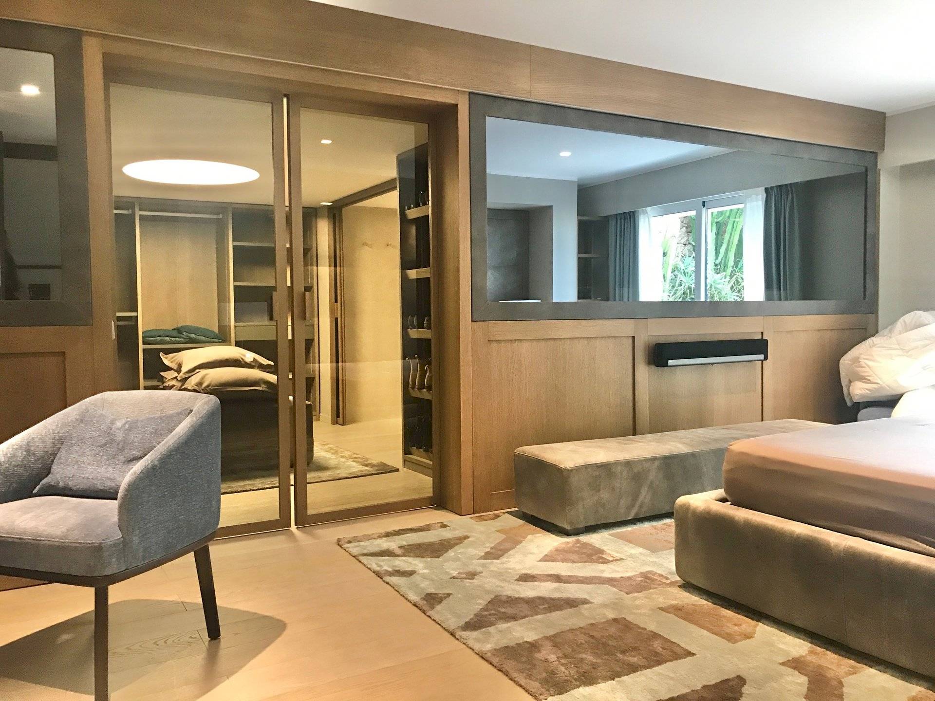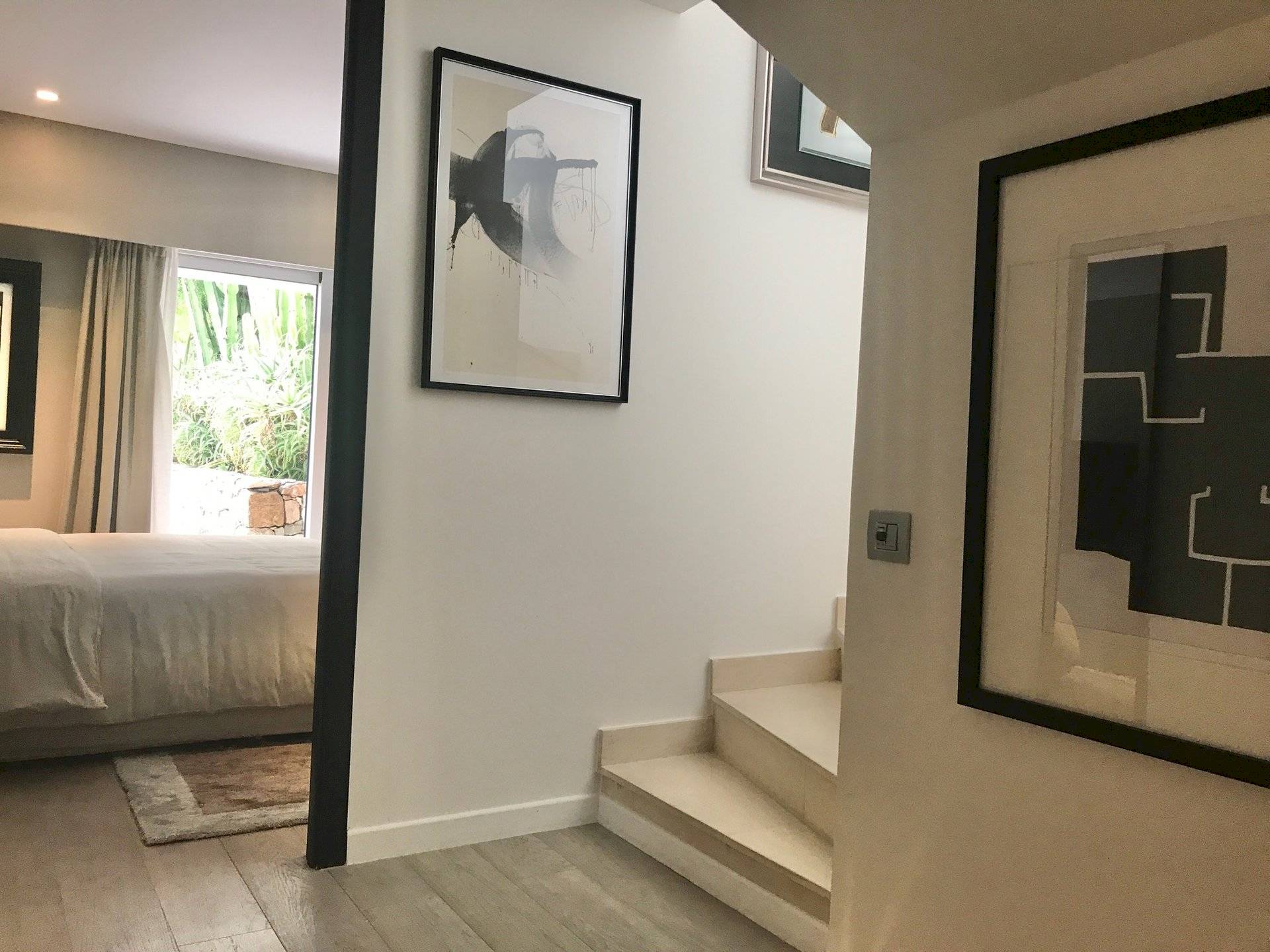 Состоит: на первом этаже прихожая, большая спальня с душевой и гардеробной, кабинет, на уровне сада просторная гостиная, столовая и оборудованная кухня, гостевой туалет, терраса с бассейном, джакузи и сад.