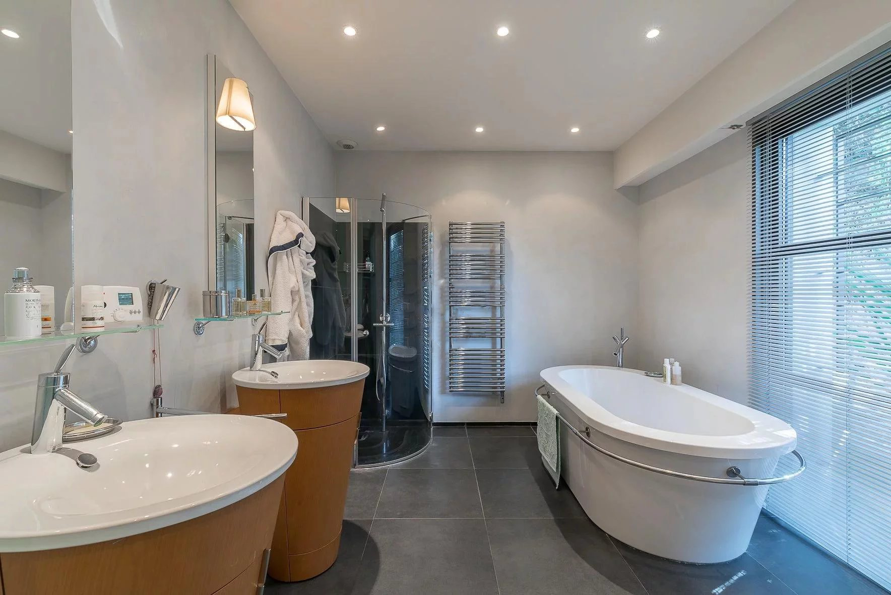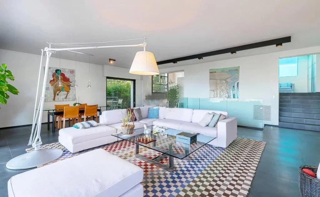 1 главная спальня с ванной комнатой, 3 спальни с ванными комнатами, 4 ванные комнаты, 1 оборудованная кухня, 1 терраса «с видом на море», 2 гаража. 1 Земля 2095 м², 1 гостиная, 1 столовая, 1 гардеробная, 1 солярий.