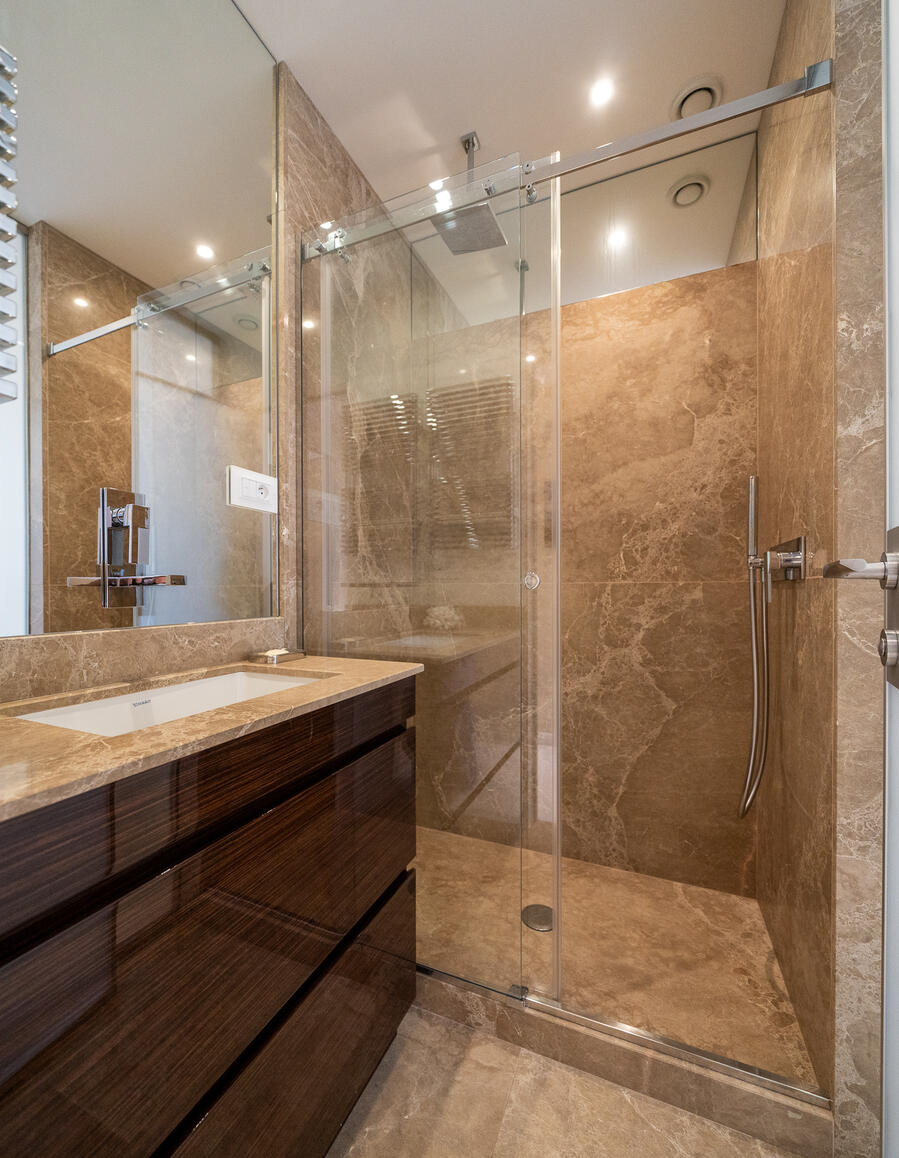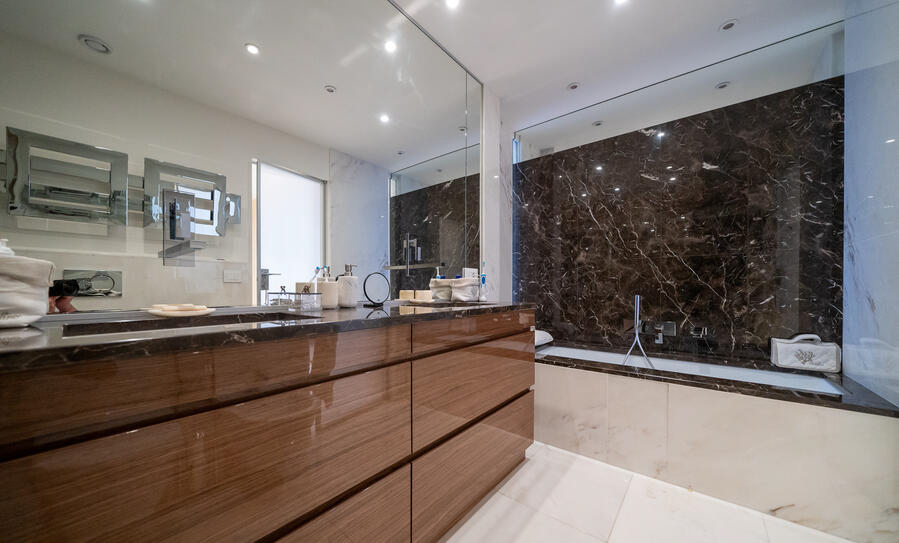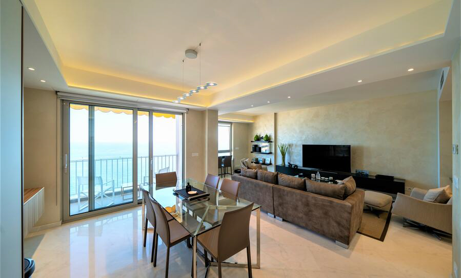 Рядом с площадью Мулен, в красивой 16-ти этажной резиденции с консьержем, эта изящная полностью отремонтированная и перестроенная квартира, окна которой выходят на пляжи Ларвотто, имеет великолепный панорамный вид на море, Кап-Мартен и Княжество.